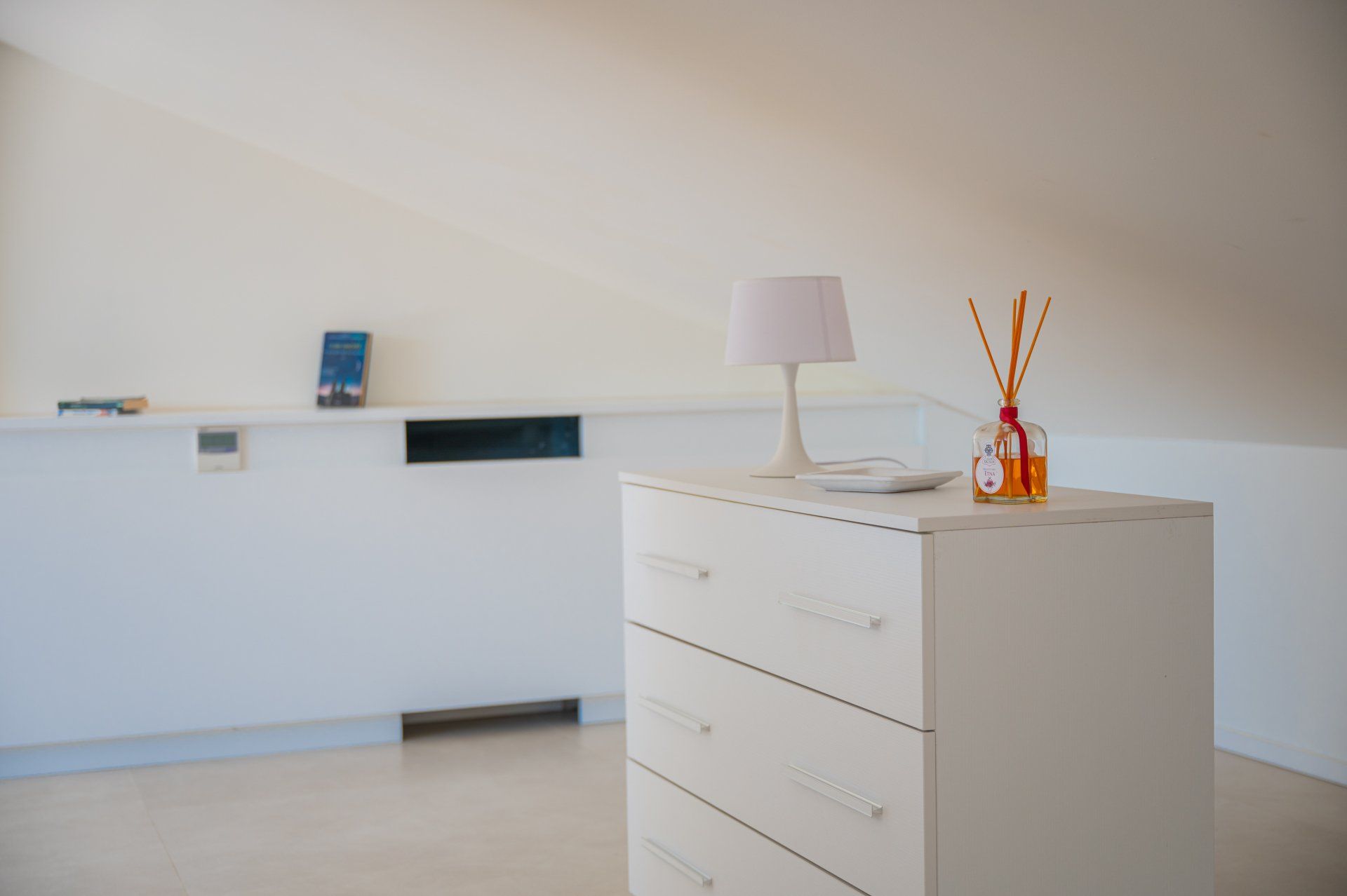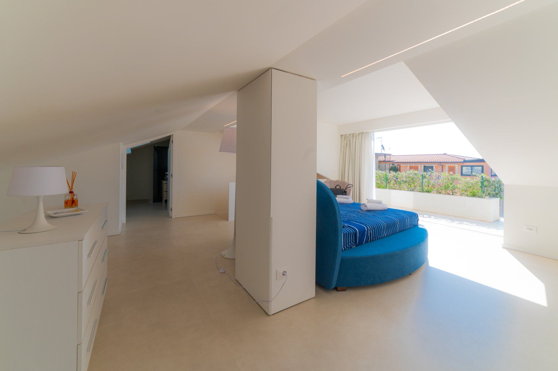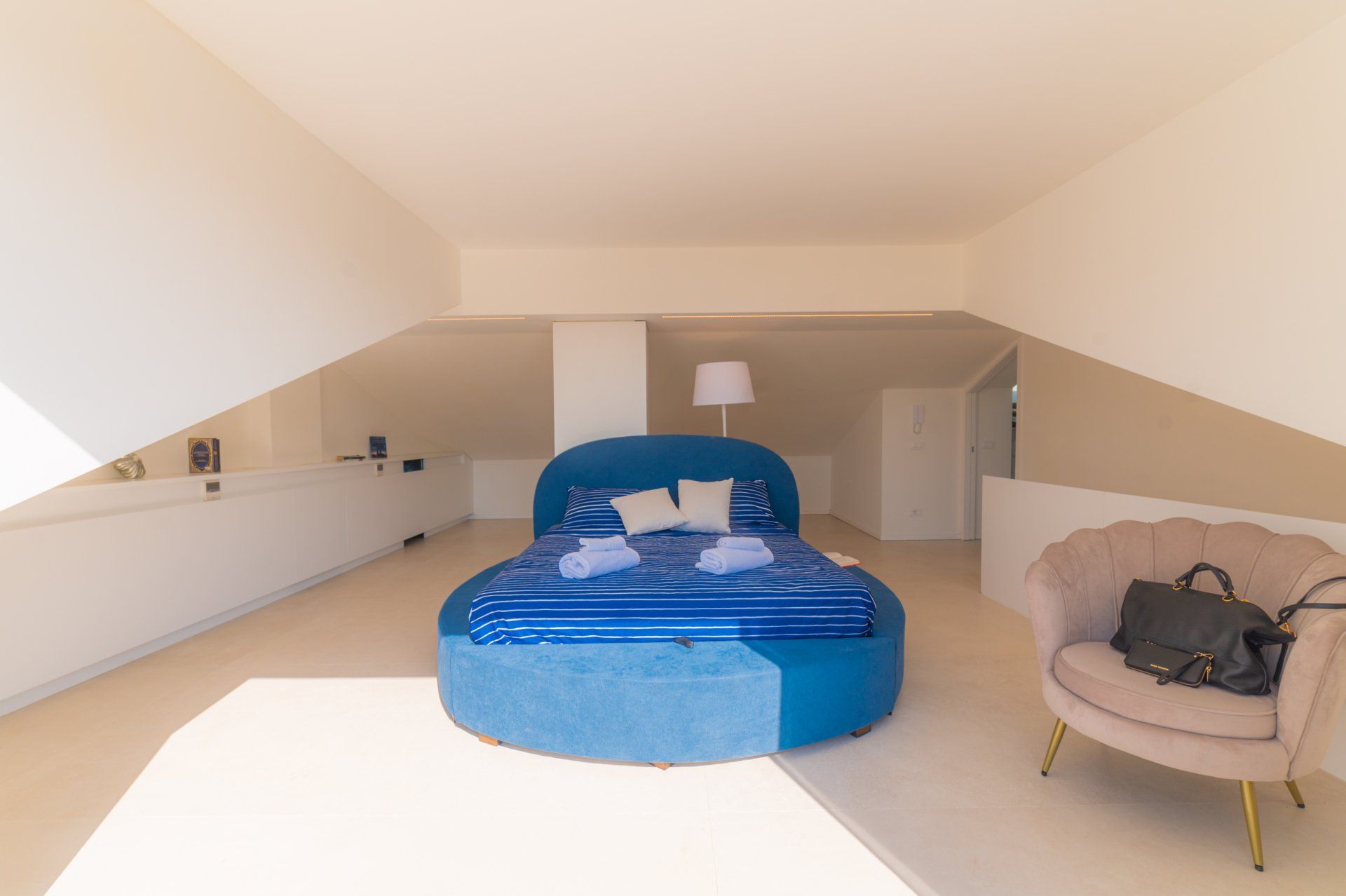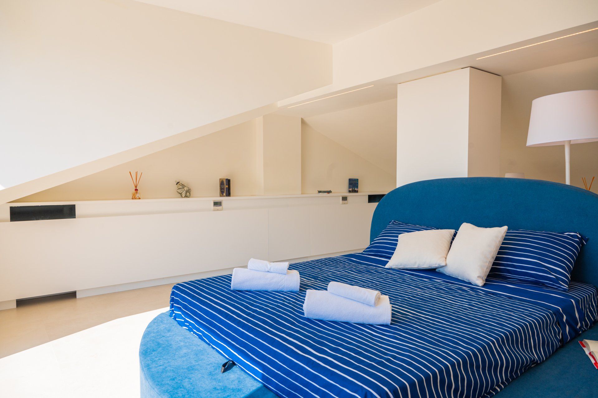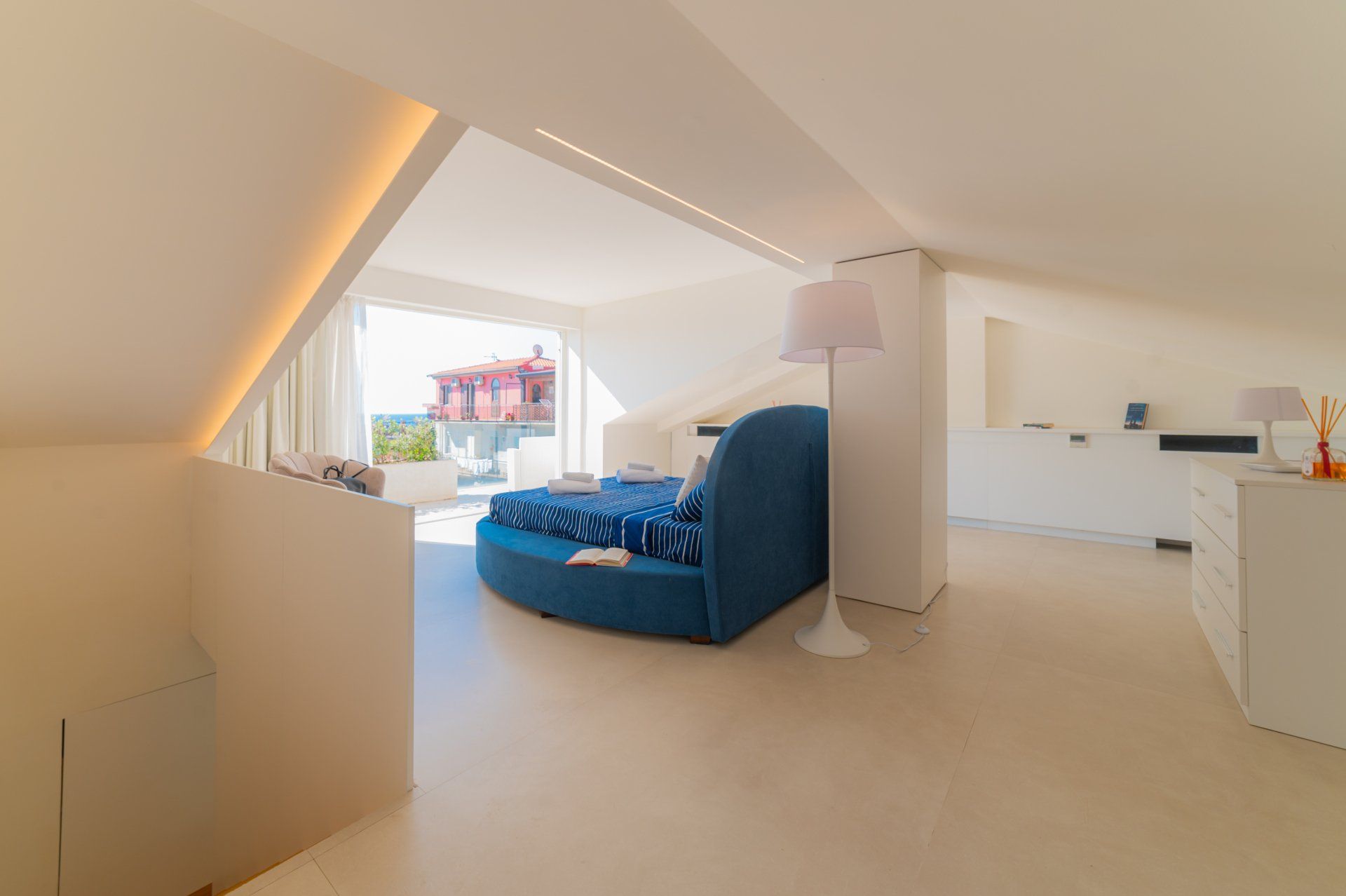 Al piano superiore si trova una mansarda abitabile destinata a camera padronale con scorcio sul mare, bagno esclusivo con grande doccia, cabina armadio, il tutto circondato da un terrazzo con divani e sdraio.