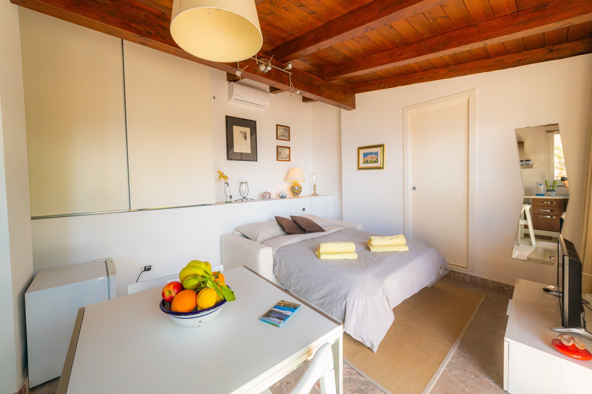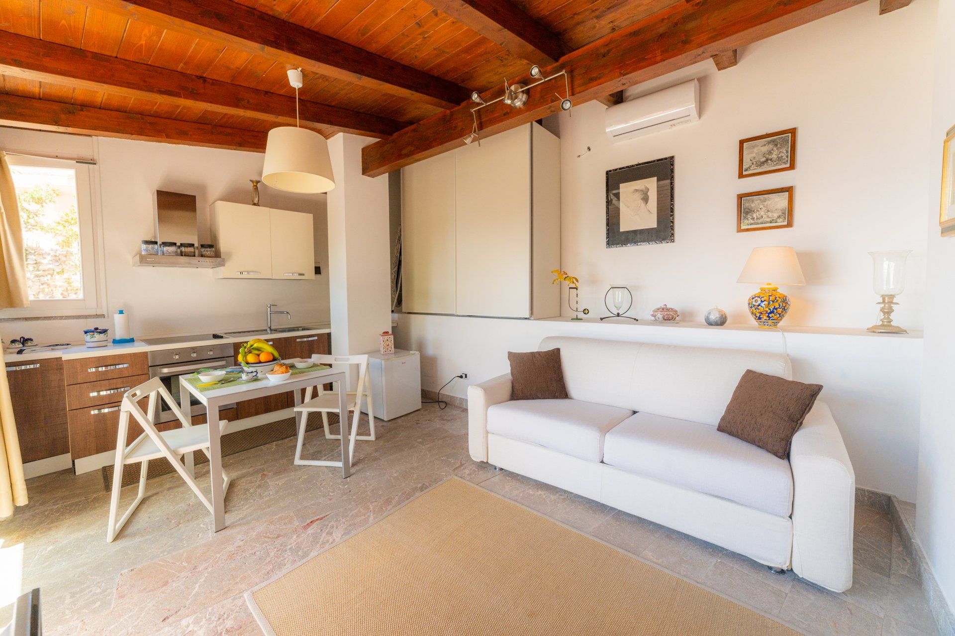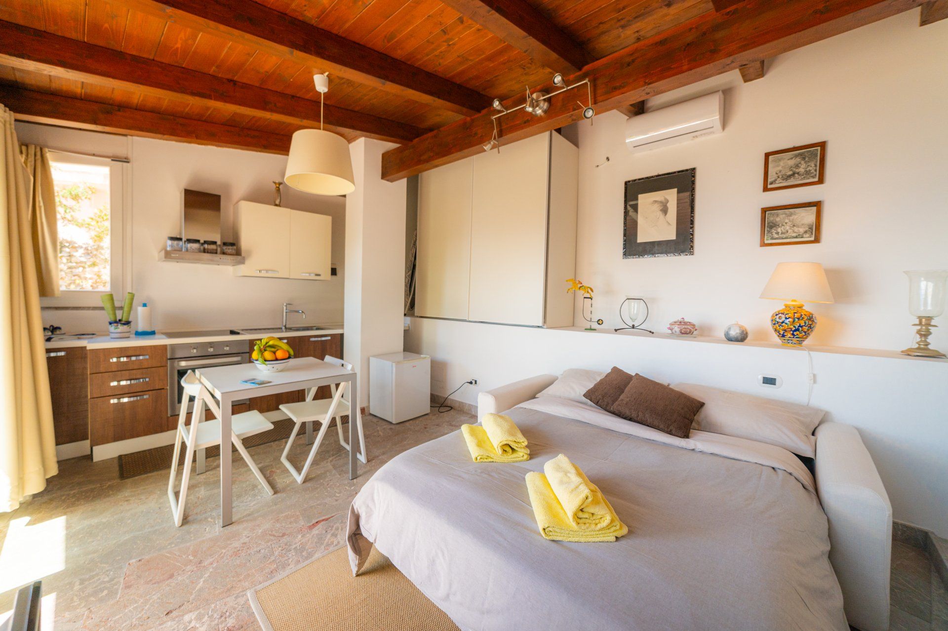 Si trova, all’interno di una villa sita in mezzo al verde a cinque minuti a piedi dal centro città, un appartamento formato da un unico ambiente di 20 mq circa con tetto in travi di legno, cucina, tavolo, divano che si trasforma in letto per la notte e un bagno con doccia tutto rivestito in ceramiche siciliane.
