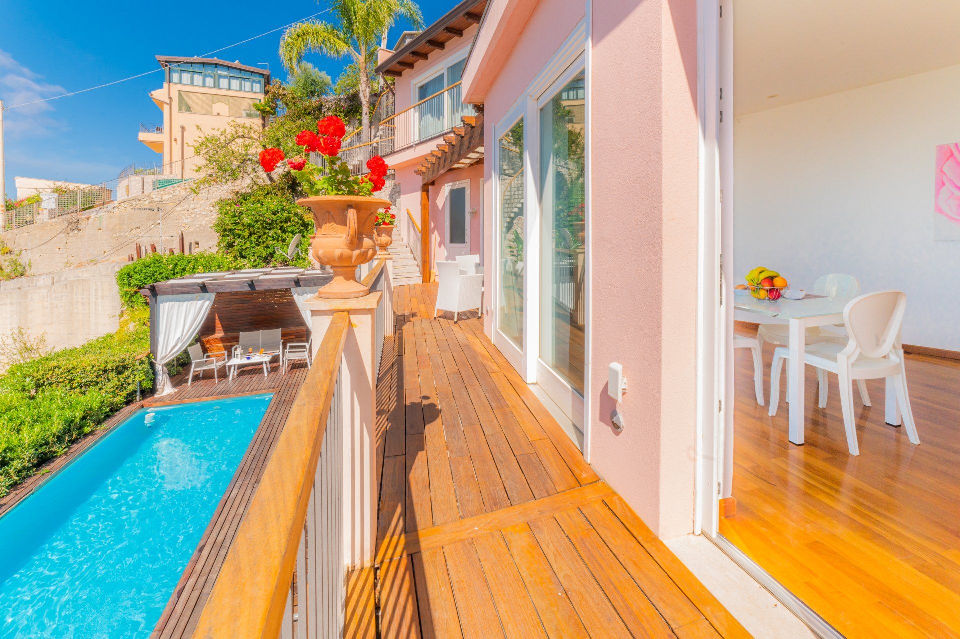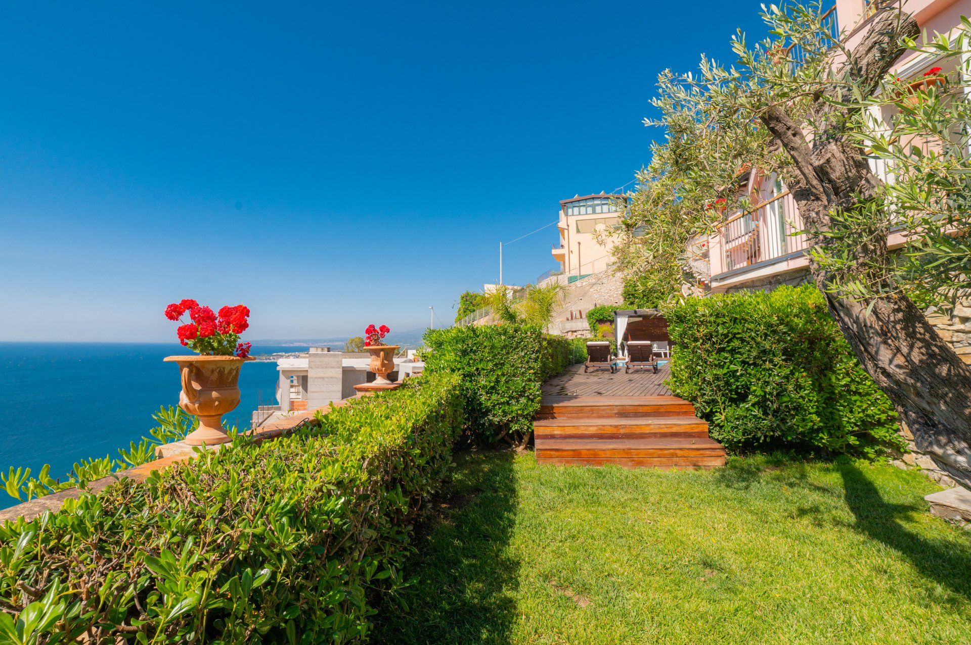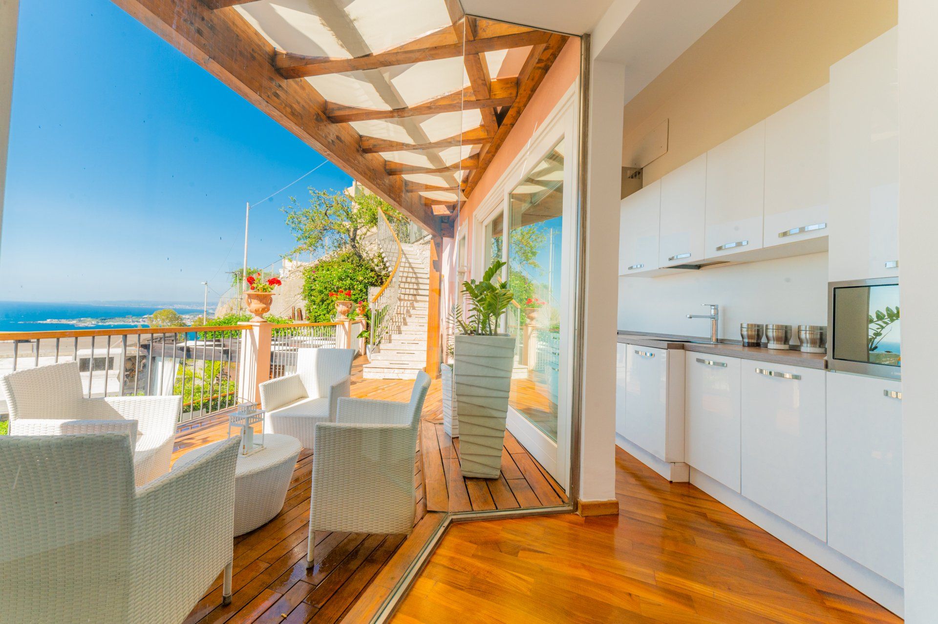 Questa soluzione è l’ideale, tra le case per una vacanza a Taormina, per coppie che amano vivere la casa e anche per famiglie con bambini piccoli che godrebbero del giardino e della piscina senza dover per forza raggiungere le spiagge godendoti attimi di relax sulla terrazza privata dell’appartamento, a uso esclusivo.