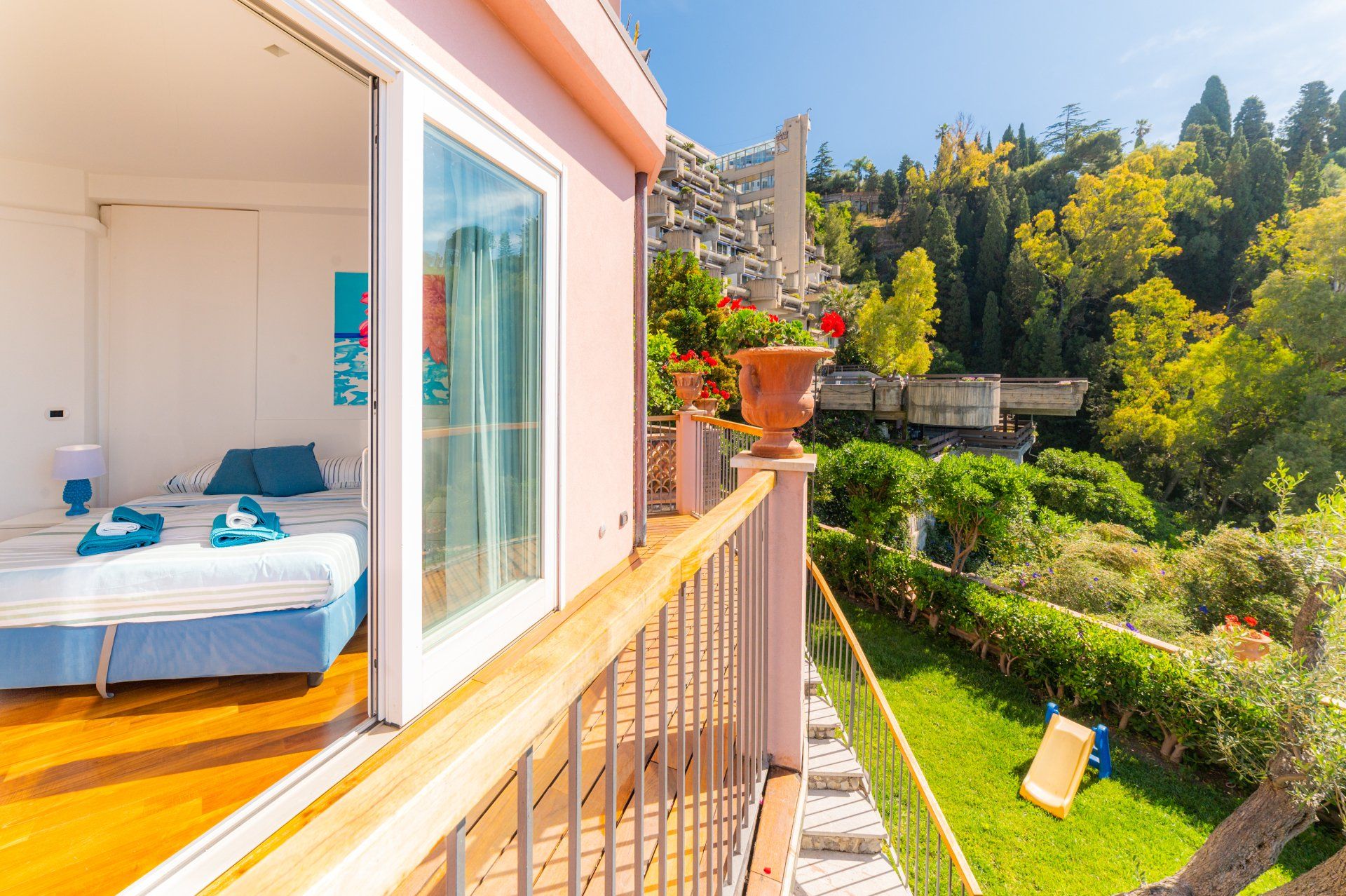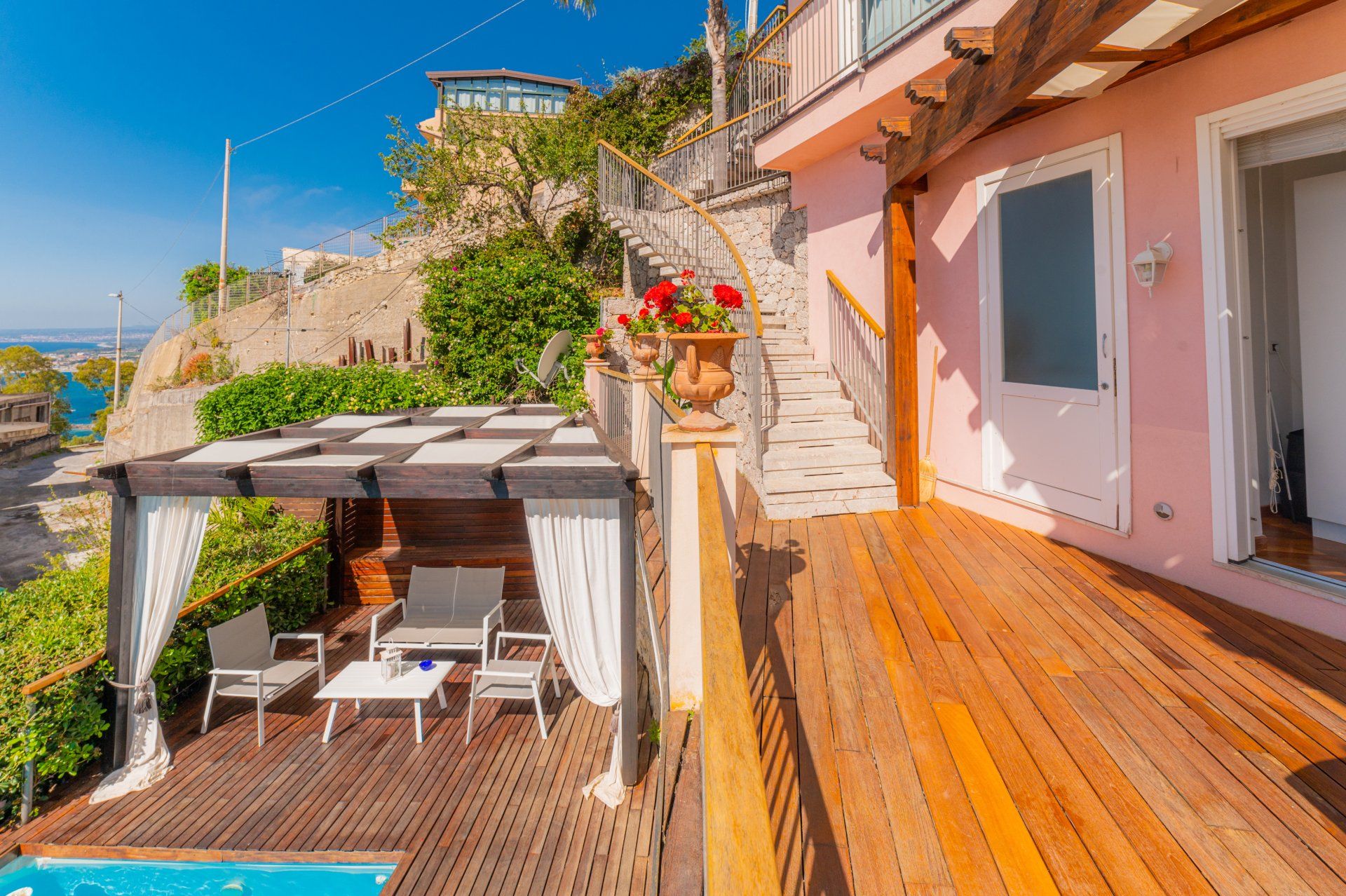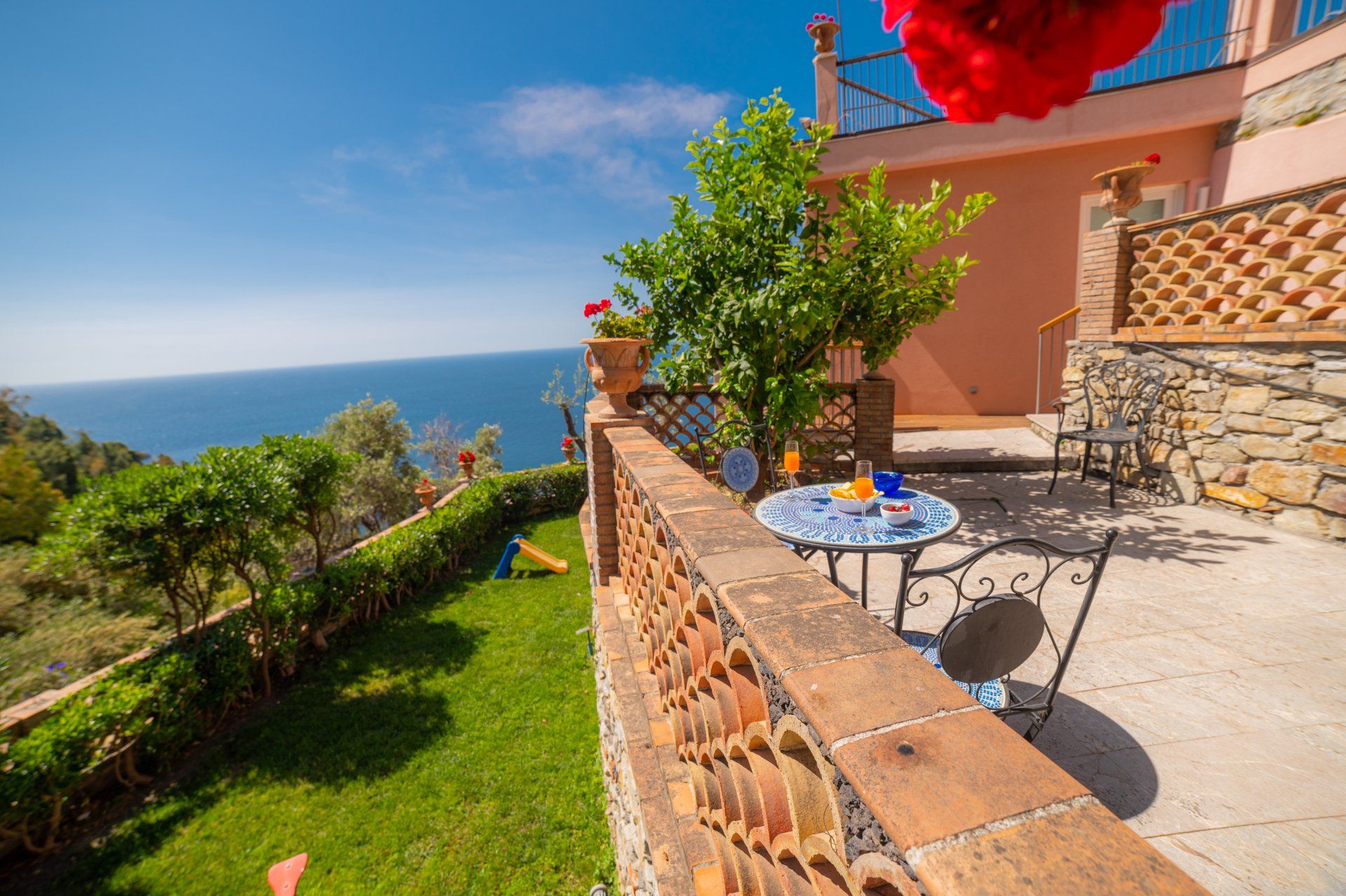 Questa soluzione è l’ideale, tra le case per una vacanza a Taormina, per coppie che amano vivere la casa e anche per famiglie con bambini piccoli che godrebbero del giardino e della piscina senza dover per forza raggiungere le spiagge godendoti attimi di relax sulla terrazza privata dell’appartamento, a uso esclusivo.