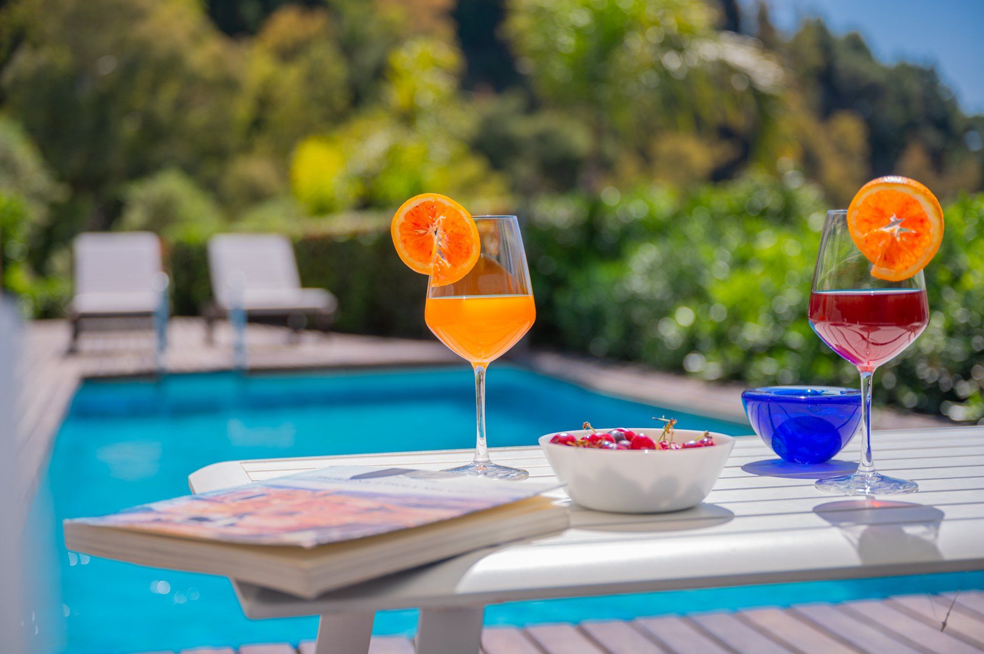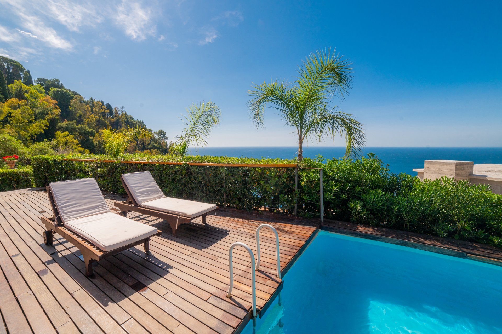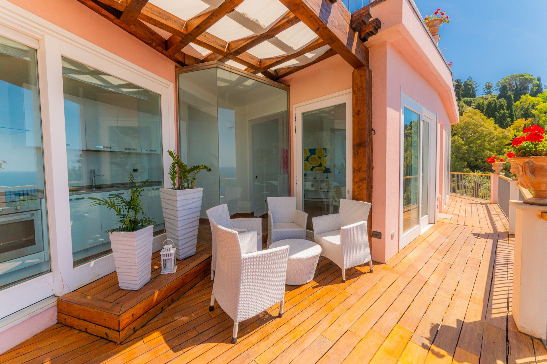Circondato da un terrazzo con un piccolo barbeque, tavolino e poltrone, fa parte della struttura anche un giardino con prato e piscina attrezzata di lettini e tettoia parasole.