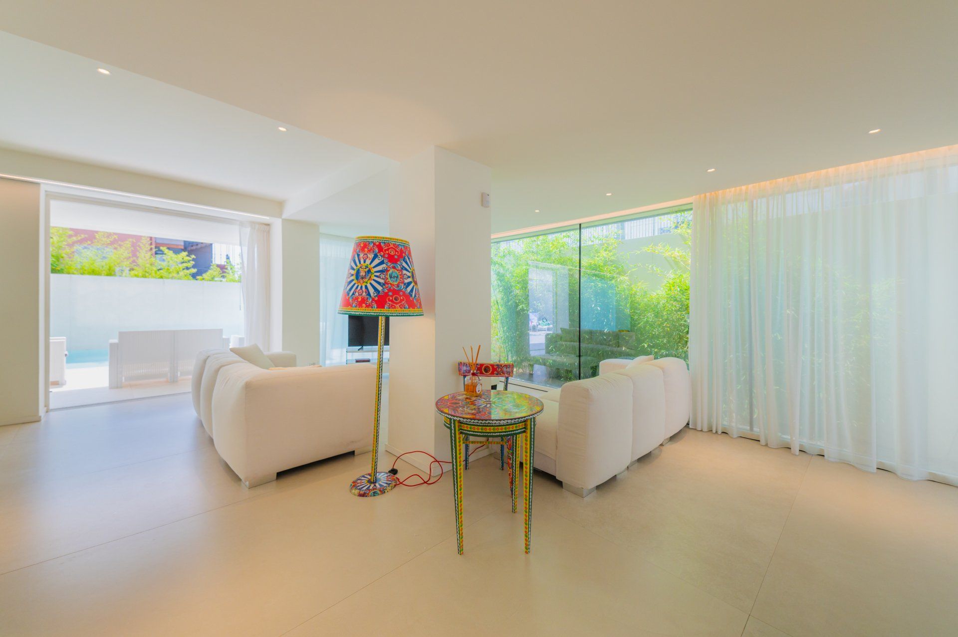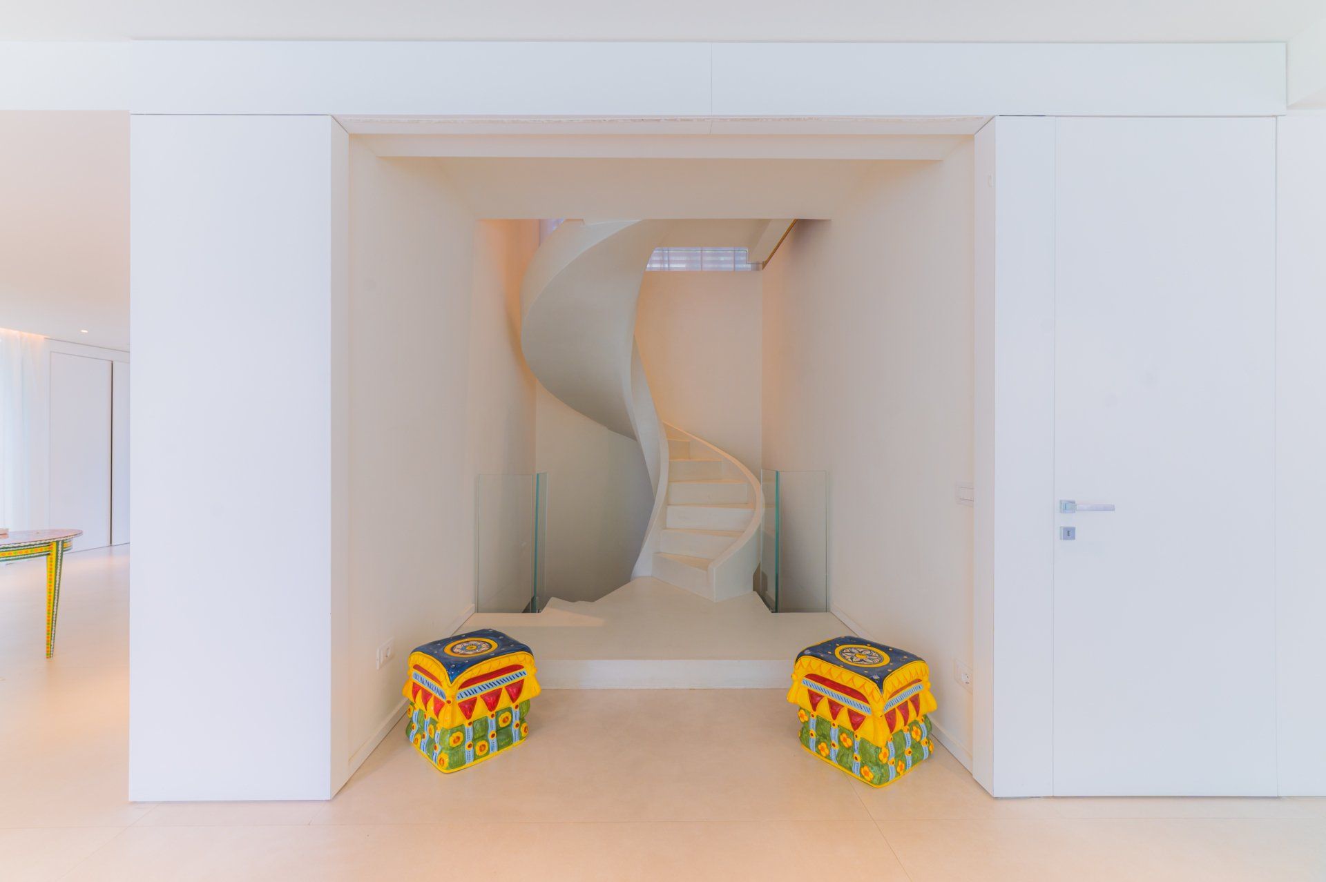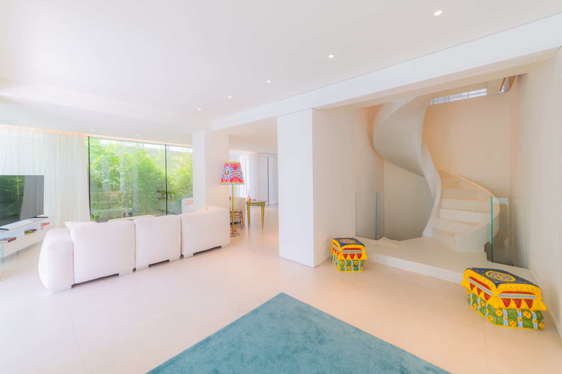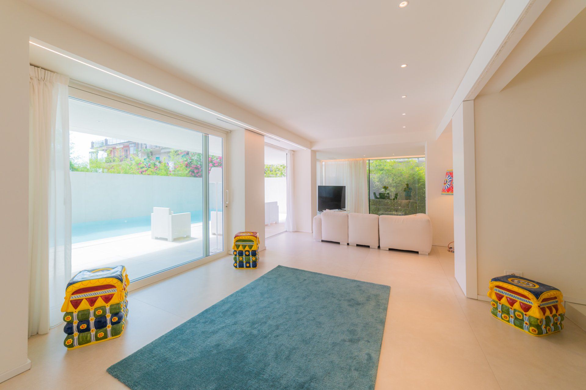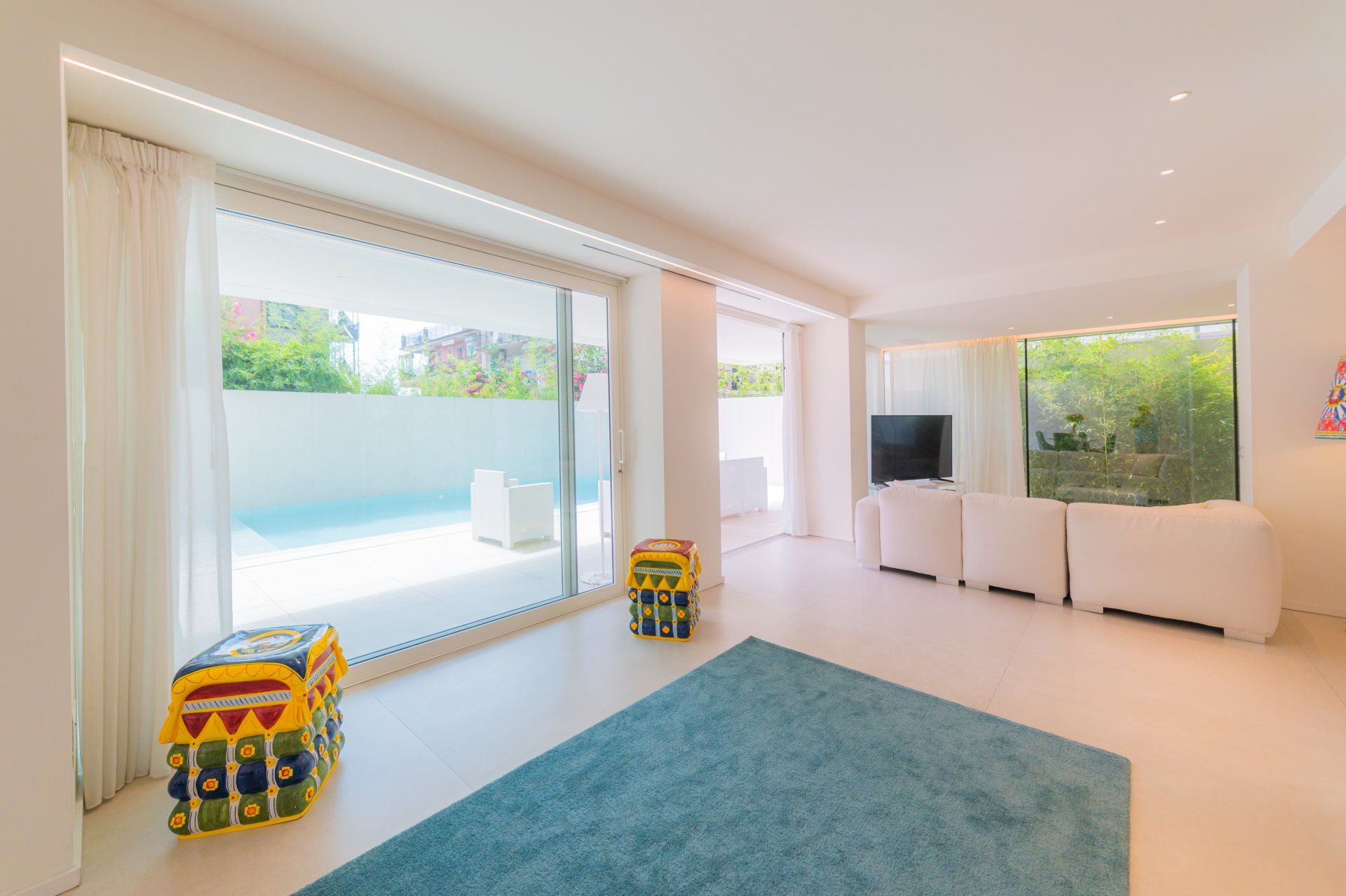 Al piano terra si trova l’ingresso open space con salotto dotato di ampi divani e tv 70 pollici, cucina attrezzata con frigo congelatore, cantinetta per vini, forno da 90 cm, lavastoviglie, grande tavolo da pranzo e lavanderia, più un bagno con doccia. Lo spazio è circondato da ampie vetrate scorrevoli che danno direttamente sulla piscina solarium, salotto esterno e tavolo da pranzo all’aperto.