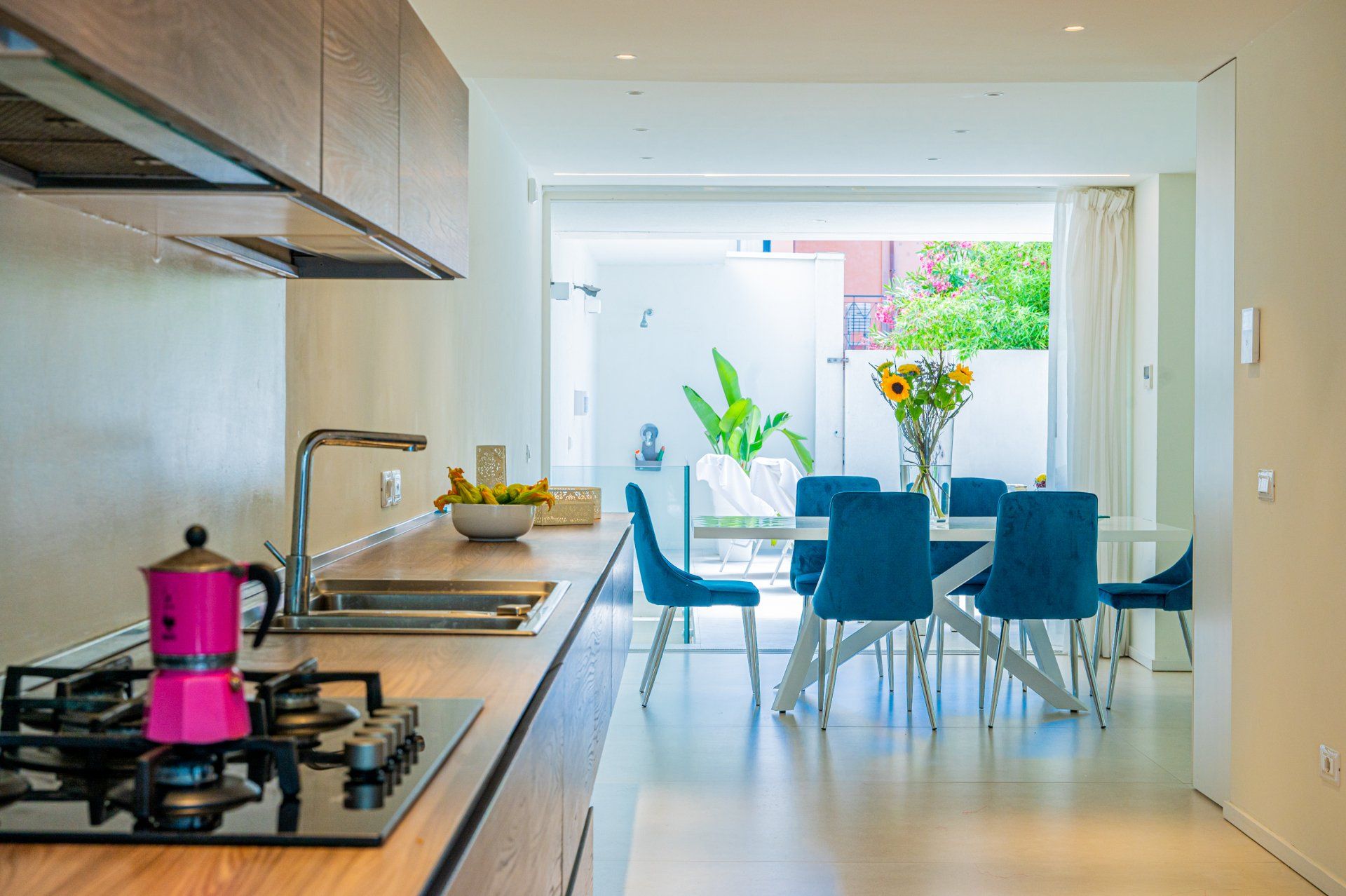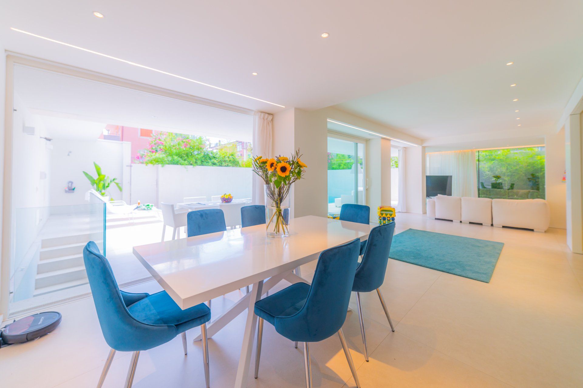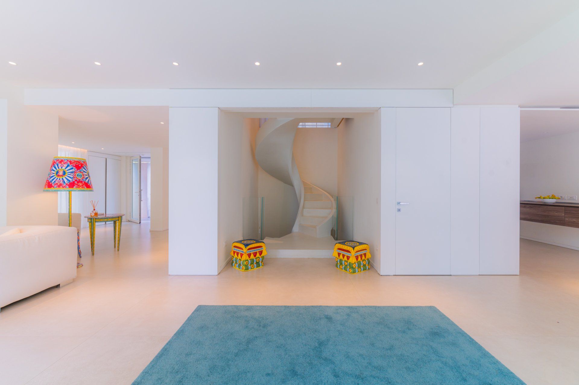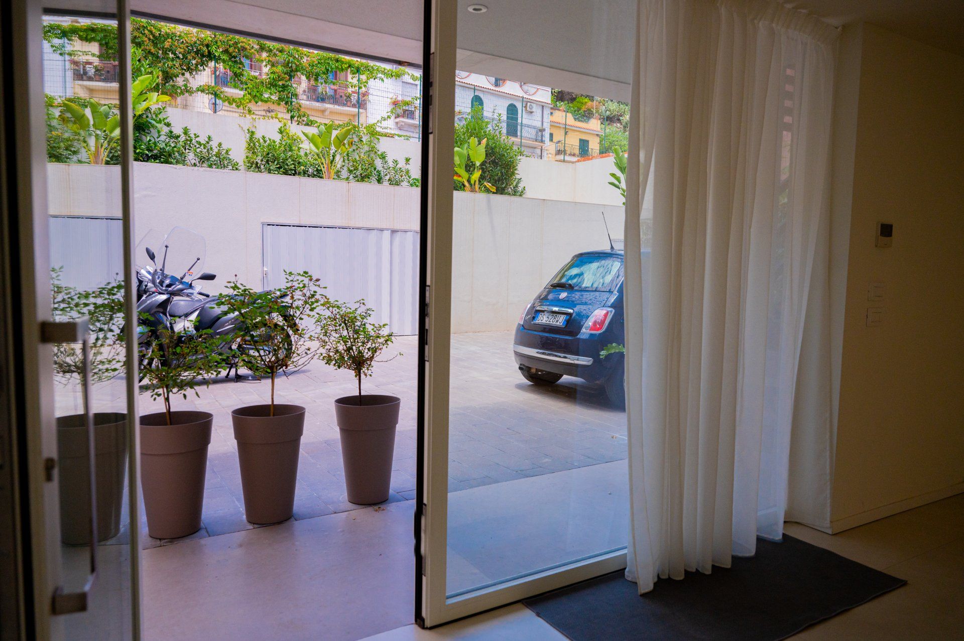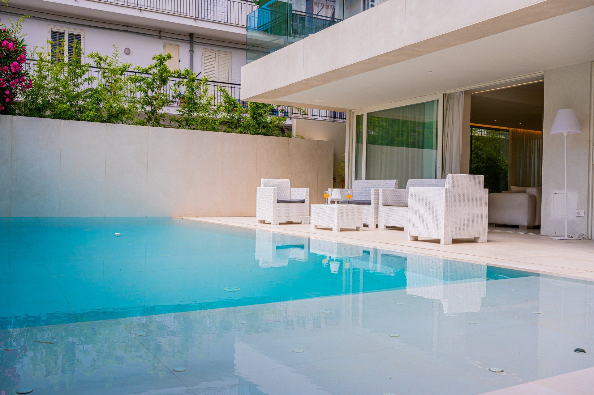 Al piano terra si trova l’ingresso open space con salotto dotato di ampi divani e tv 70 pollici, cucina attrezzata con frigo congelatore, cantinetta per vini, forno da 90 cm, lavastoviglie, grande tavolo da pranzo e lavanderia, più un bagno con doccia. Lo spazio è circondato da ampie vetrate scorrevoli che danno direttamente sulla piscina solarium, salotto esterno e tavolo da pranzo all’aperto.
