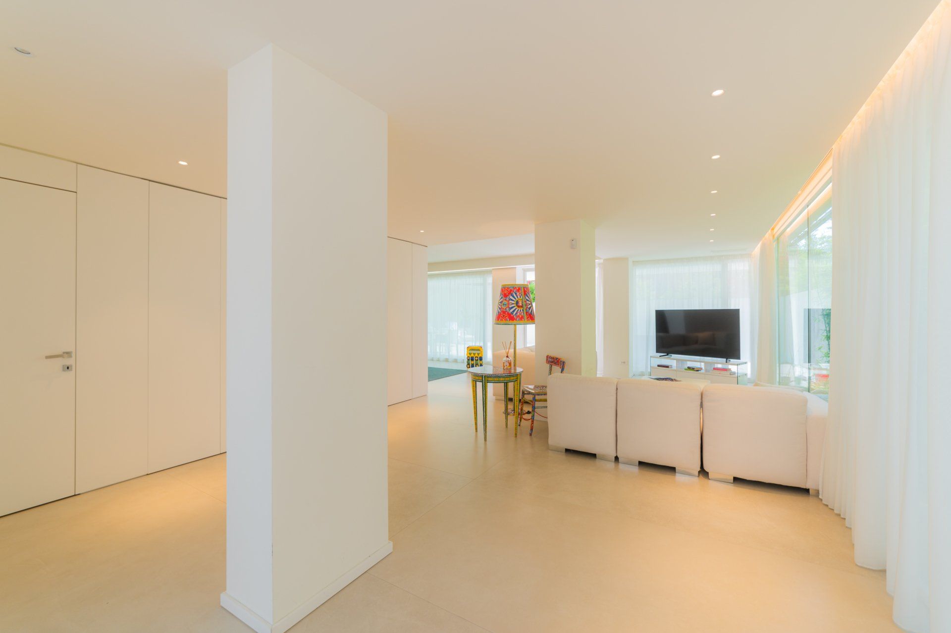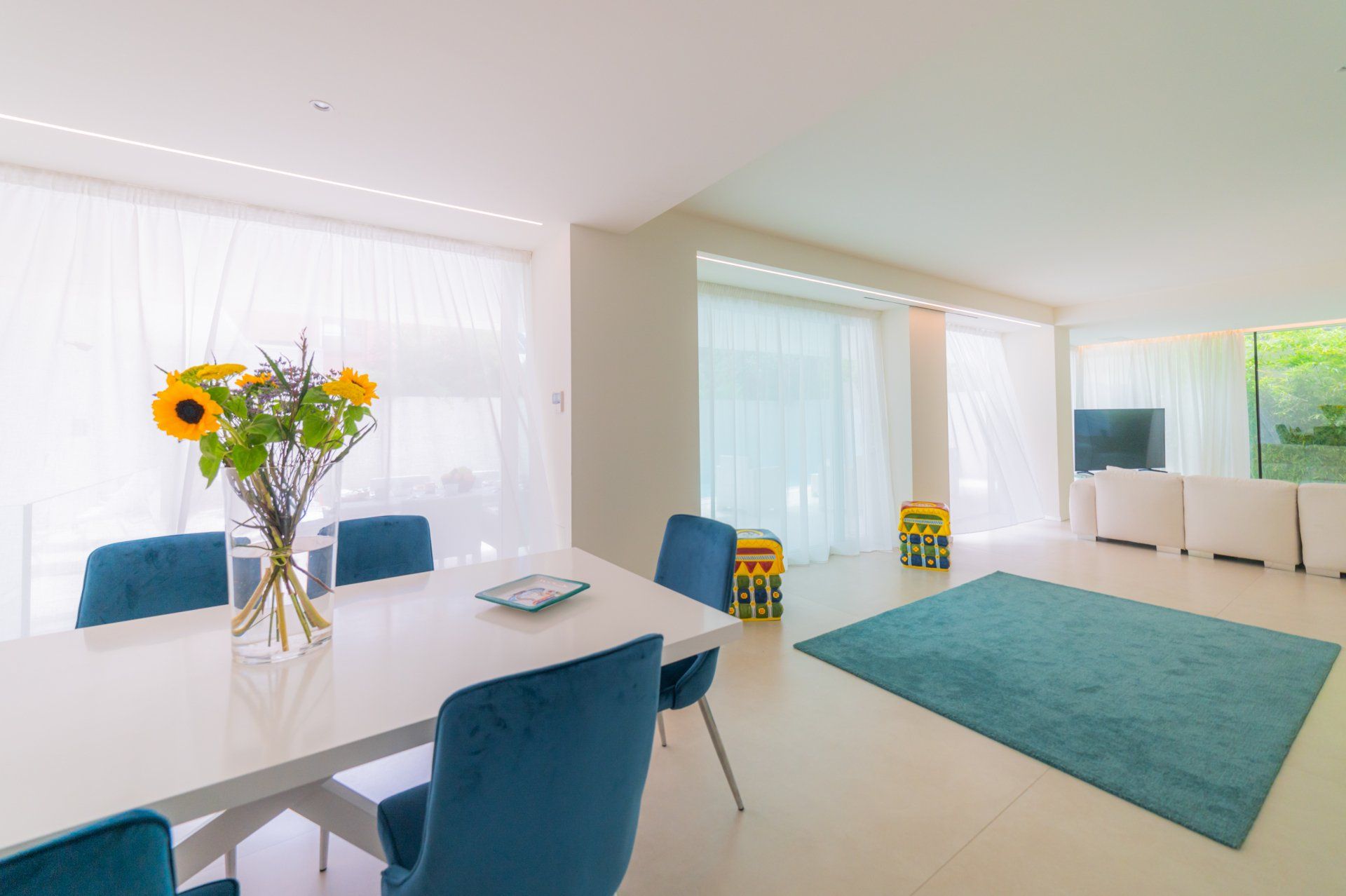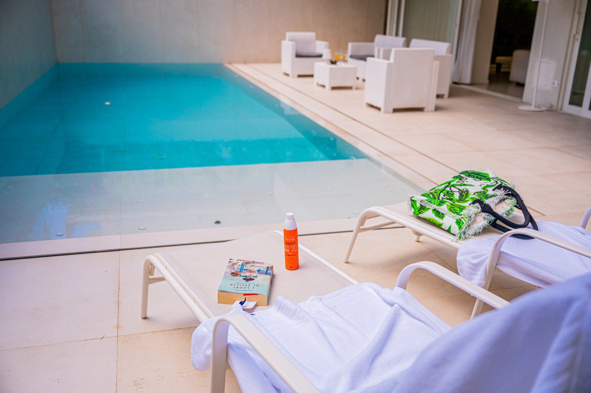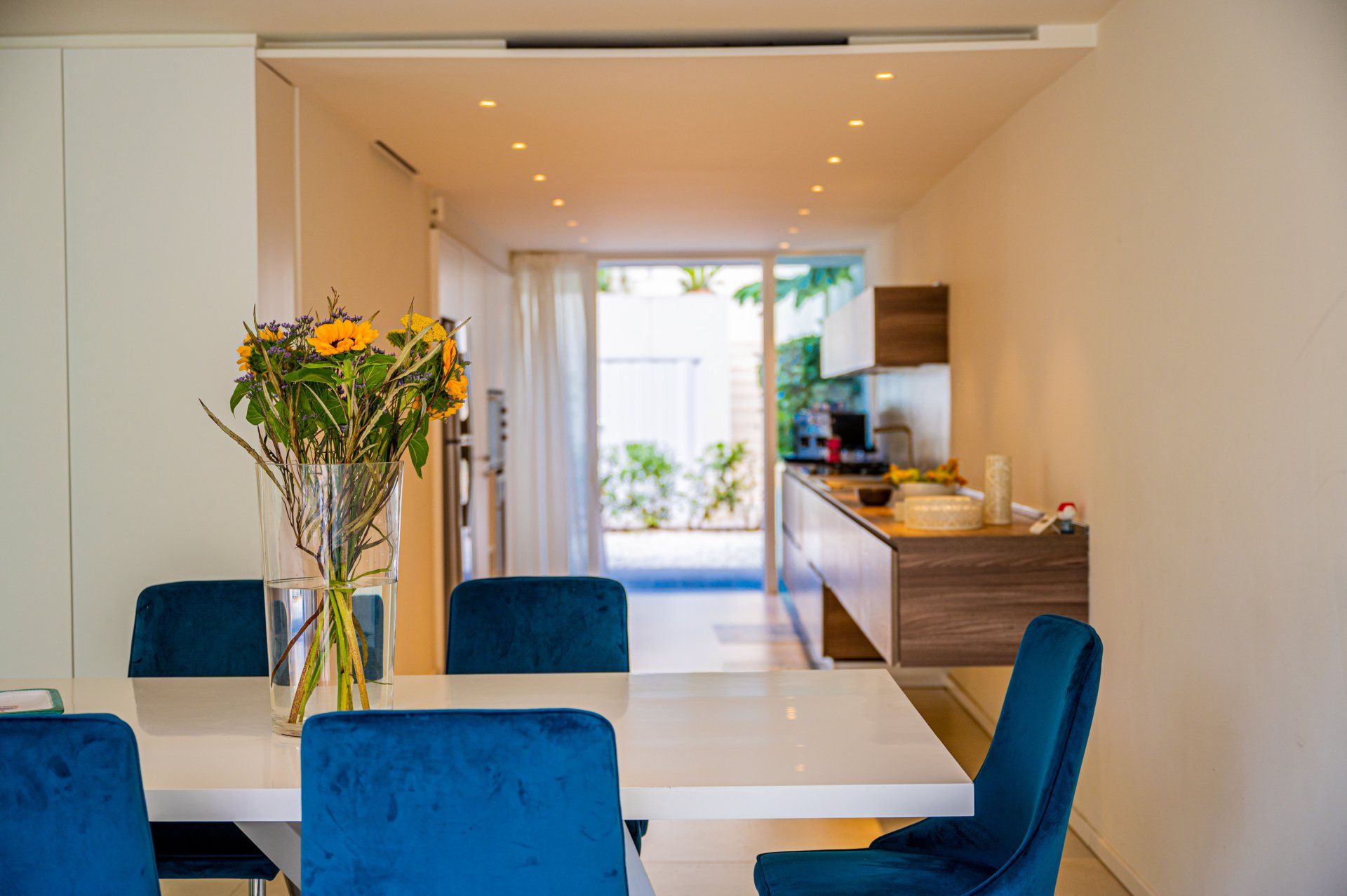 Al piano terra si trova l’ingresso open space con salotto dotato di ampi divani e tv 70 pollici, cucina attrezzata con frigo congelatore, cantinetta per vini, forno da 90 cm, lavastoviglie, grande tavolo da pranzo e lavanderia, più un bagno con doccia. Lo spazio è circondato da ampie vetrate scorrevoli che danno direttamente sulla piscina solarium, salotto esterno e tavolo da pranzo all’aperto.