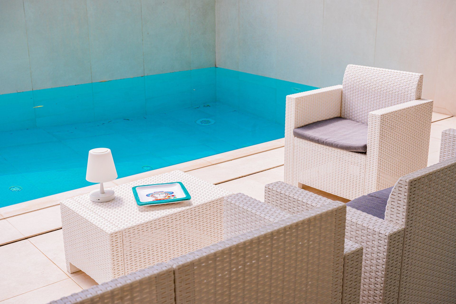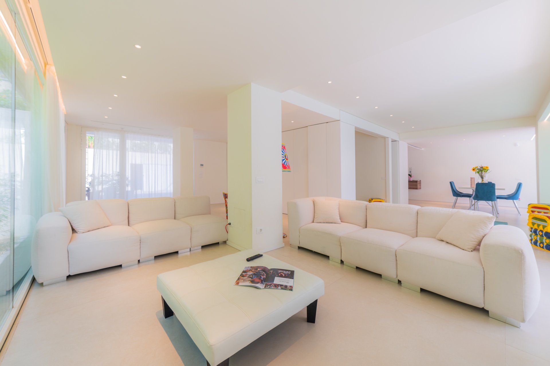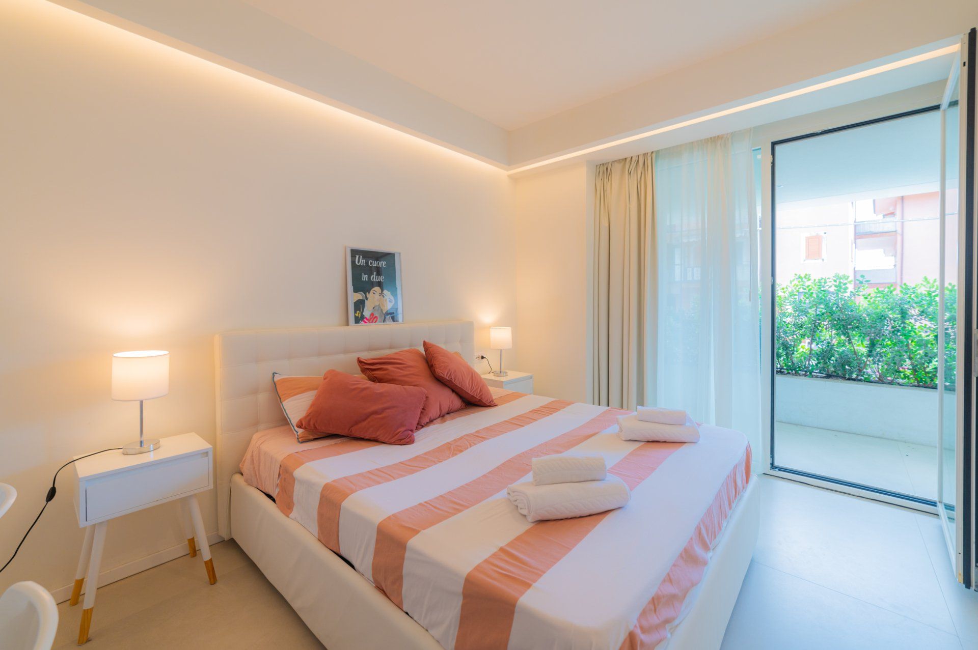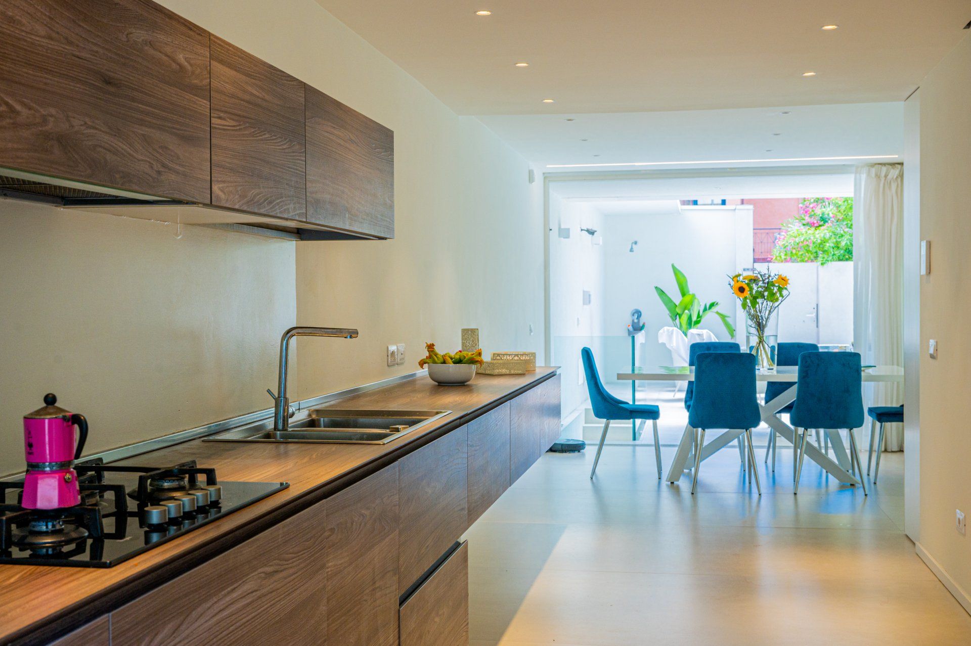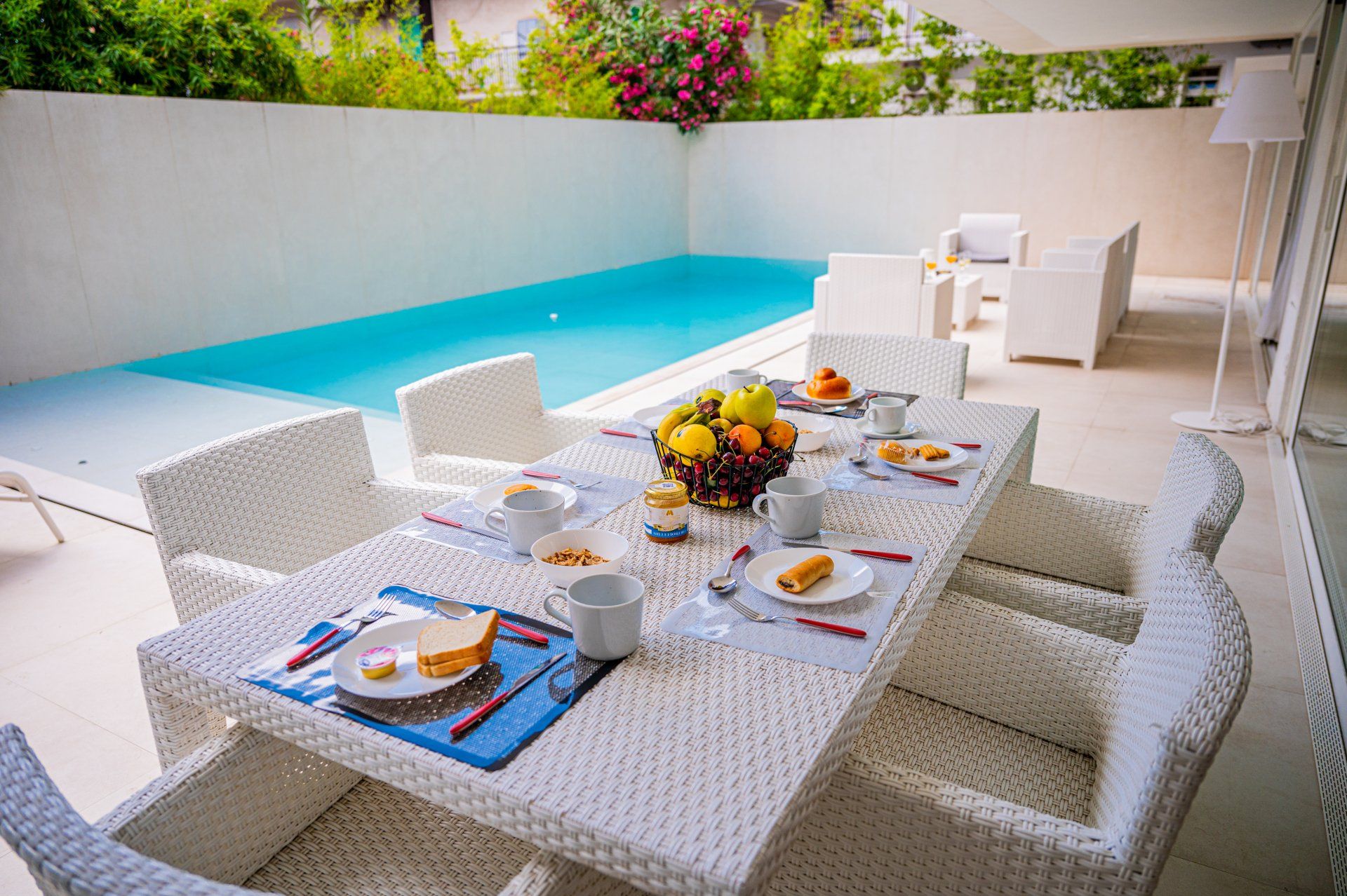 Al piano terra si trova l’ingresso open space con salotto dotato di ampi divani e tv 70 pollici, cucina attrezzata con frigo congelatore, cantinetta per vini, forno da 90 cm, lavastoviglie, grande tavolo da pranzo e lavanderia, più un bagno con doccia. Lo spazio è circondato da ampie vetrate scorrevoli che danno direttamente sulla piscina solarium, salotto esterno e tavolo da pranzo all’aperto.