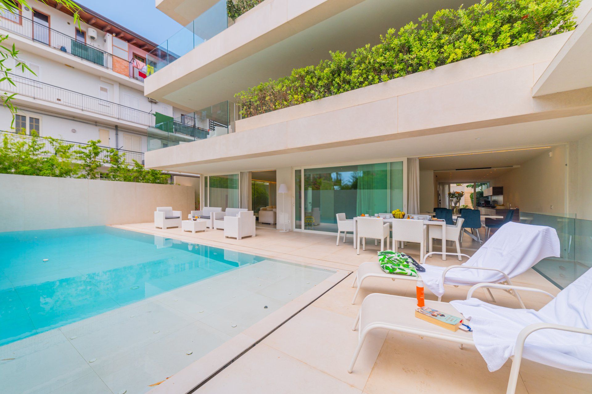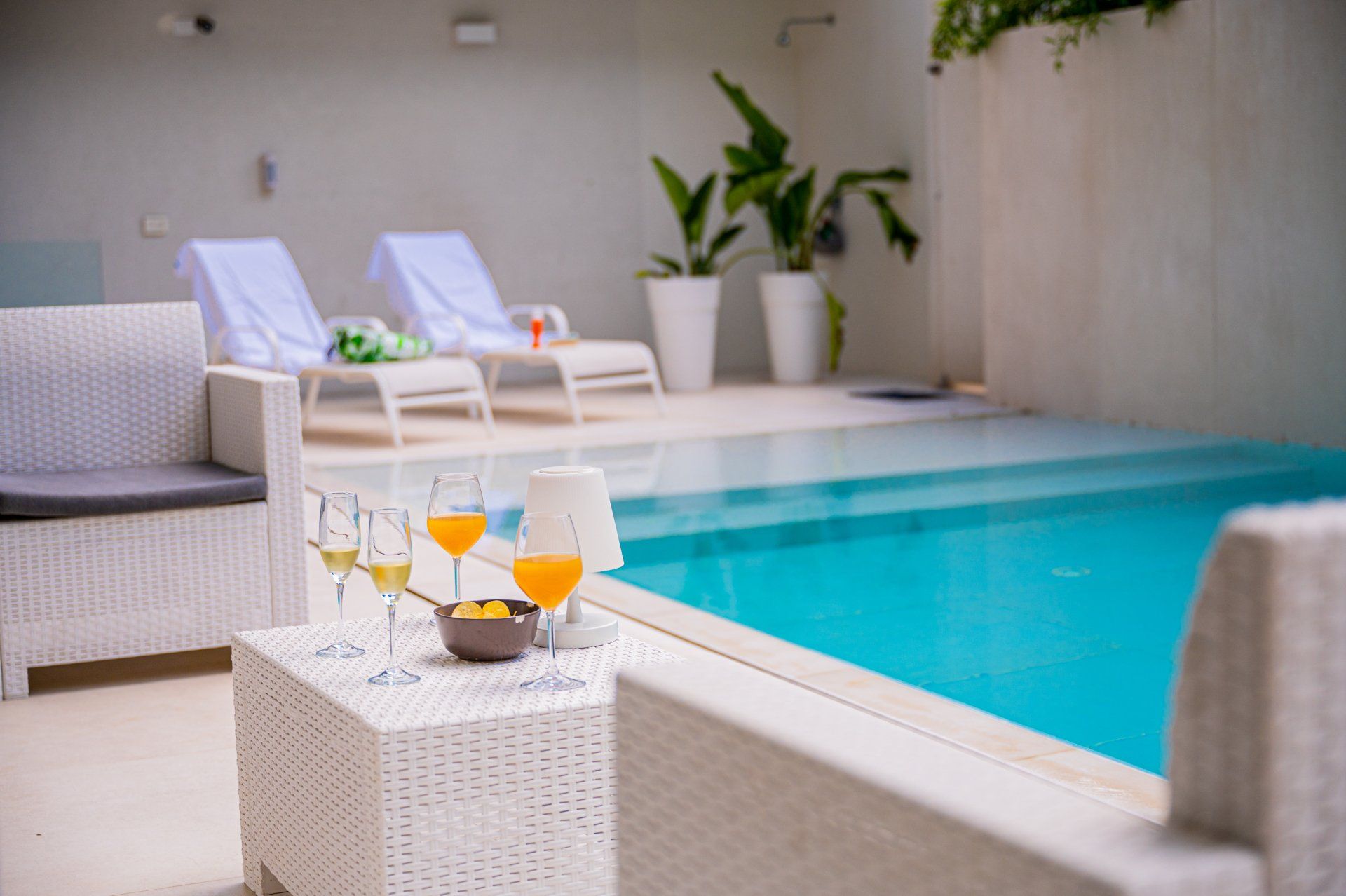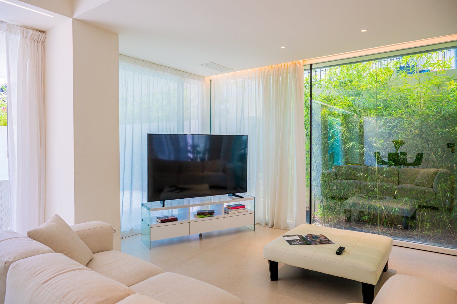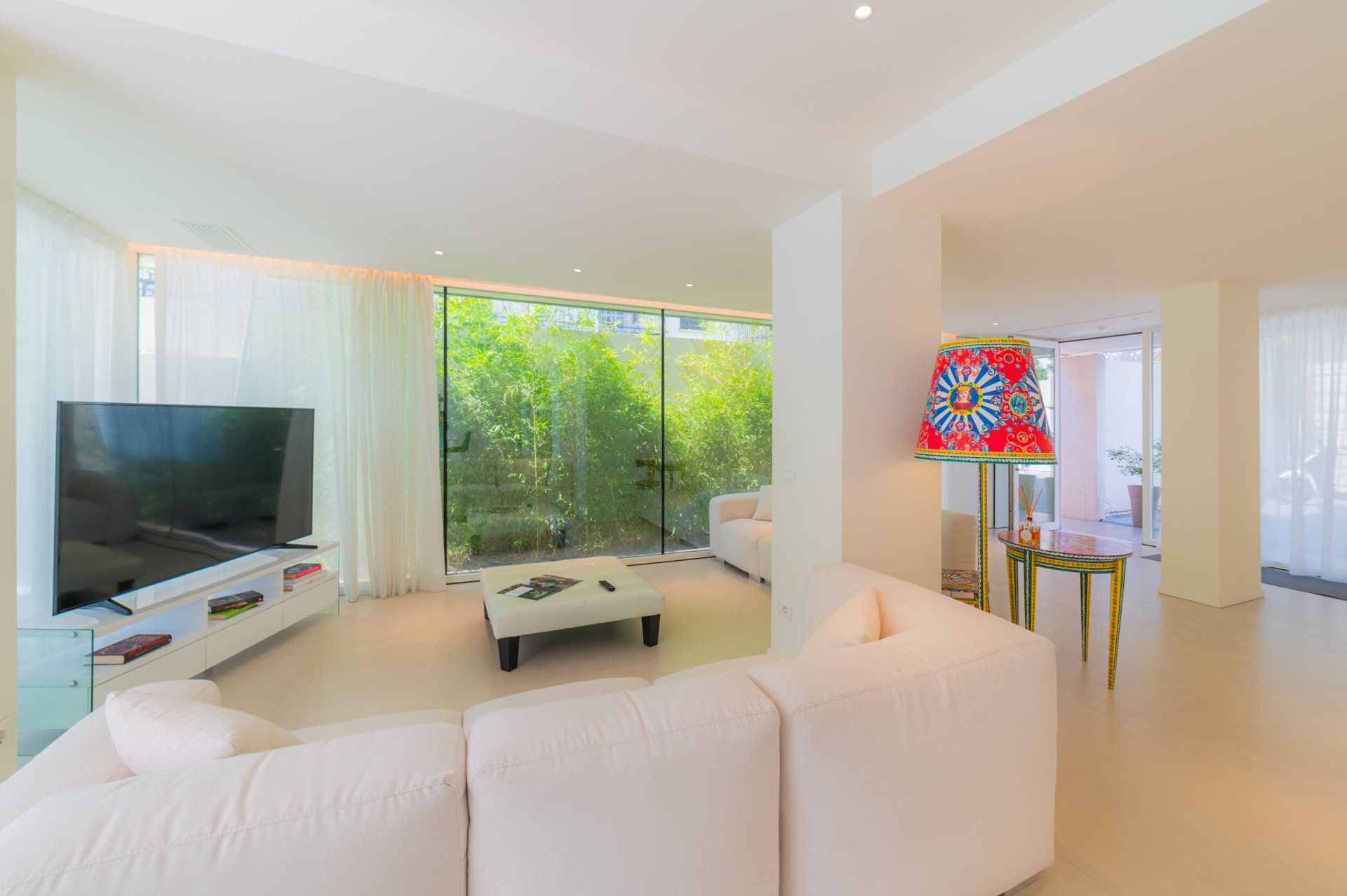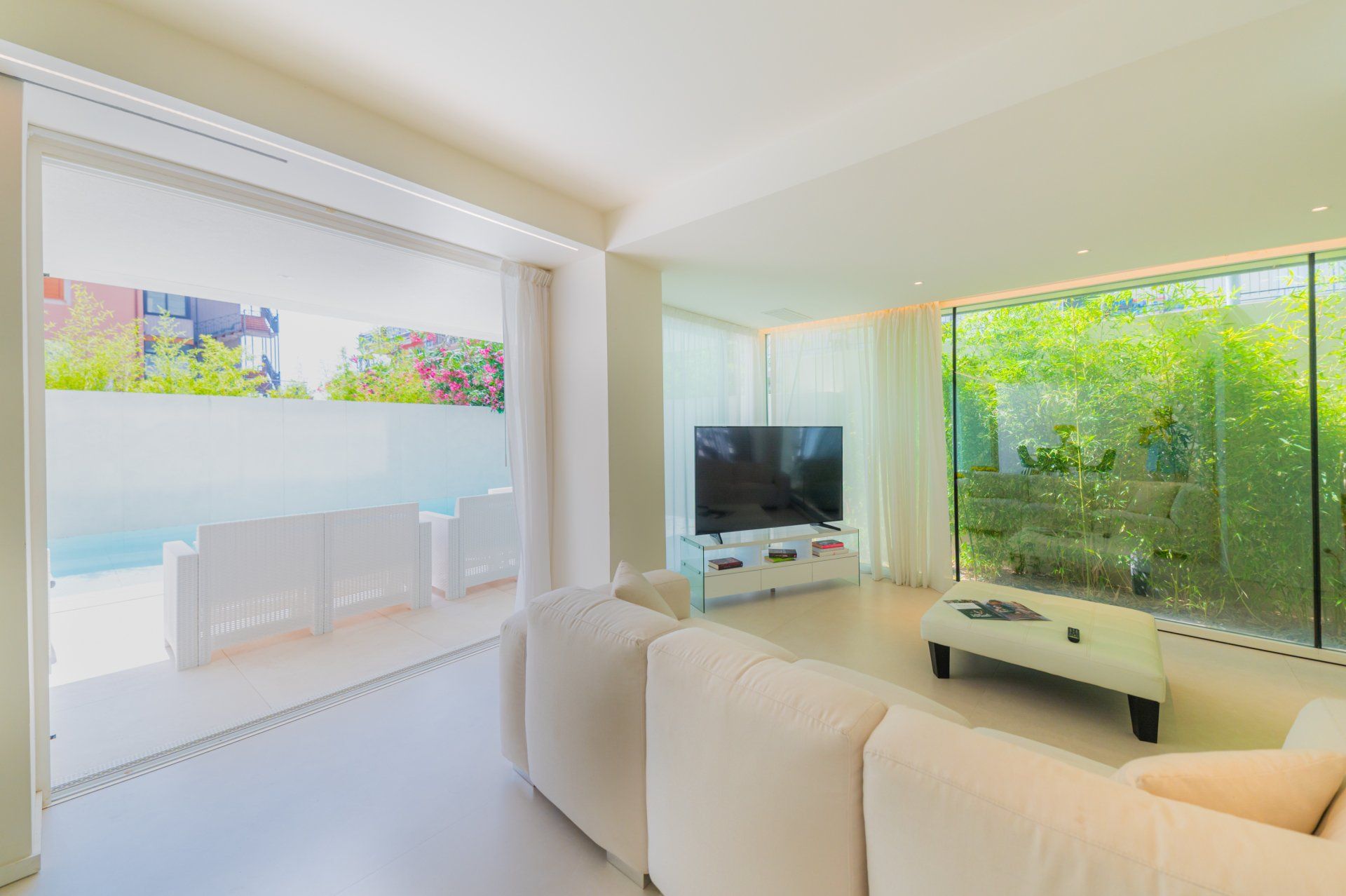 Al piano terra si trova l’ingresso open space con salotto dotato di ampi divani e tv 70 pollici, cucina attrezzata con frigo congelatore, cantinetta per vini, forno da 90 cm, lavastoviglie, grande tavolo da pranzo e lavanderia, più un bagno con doccia. Lo spazio è circondato da ampie vetrate scorrevoli che danno direttamente sulla piscina solarium, salotto esterno e tavolo da pranzo all’aperto.