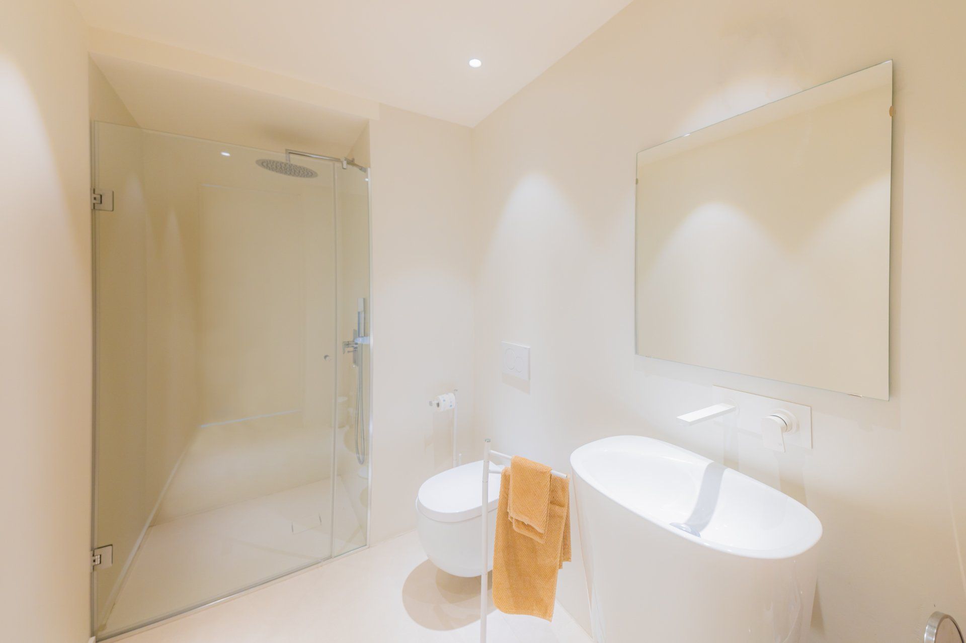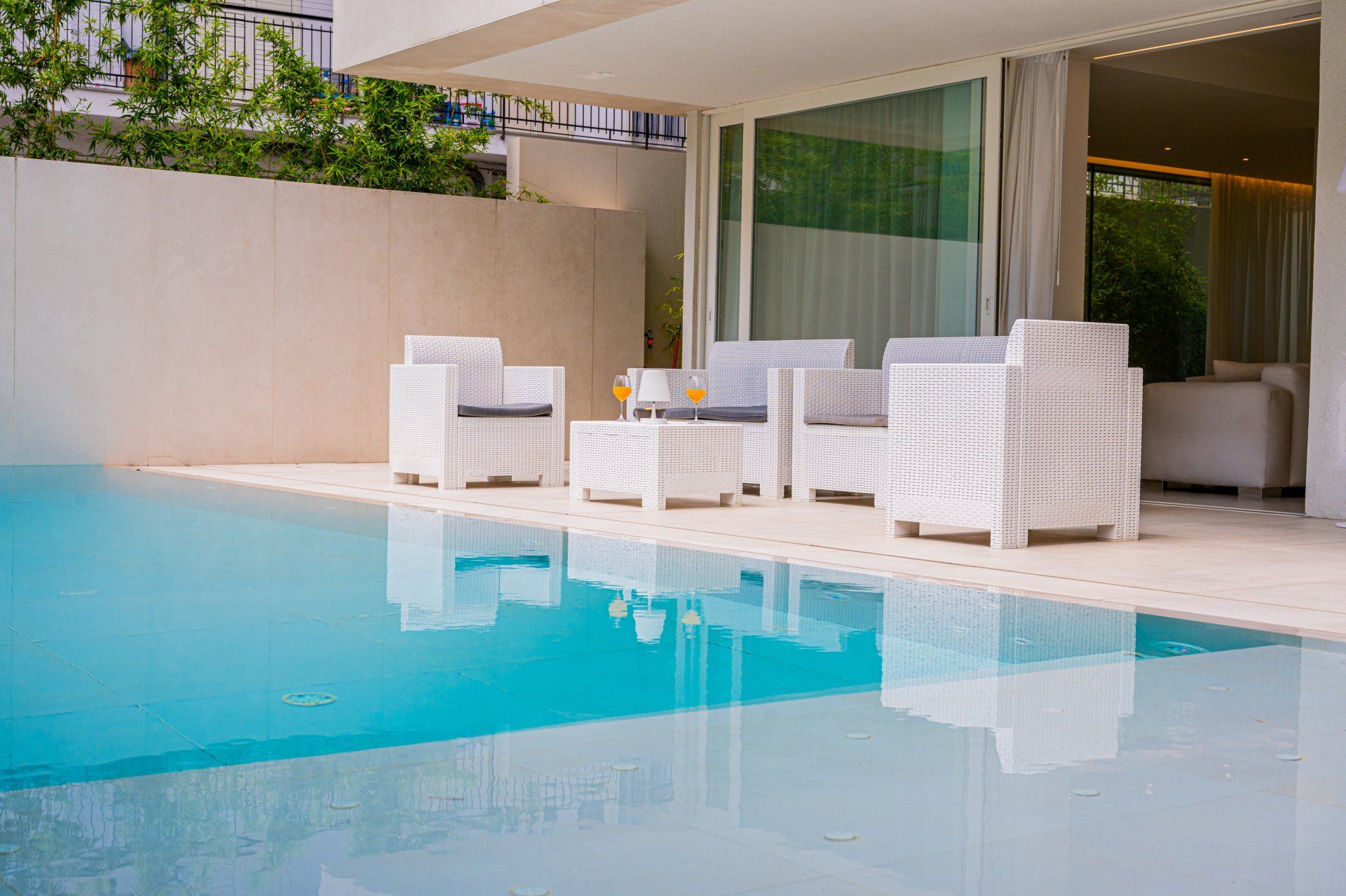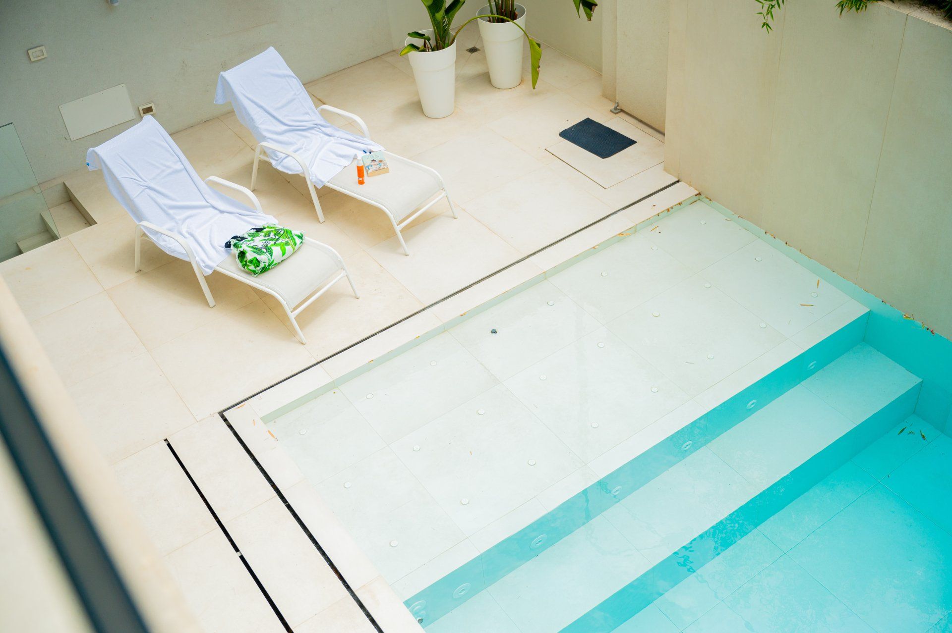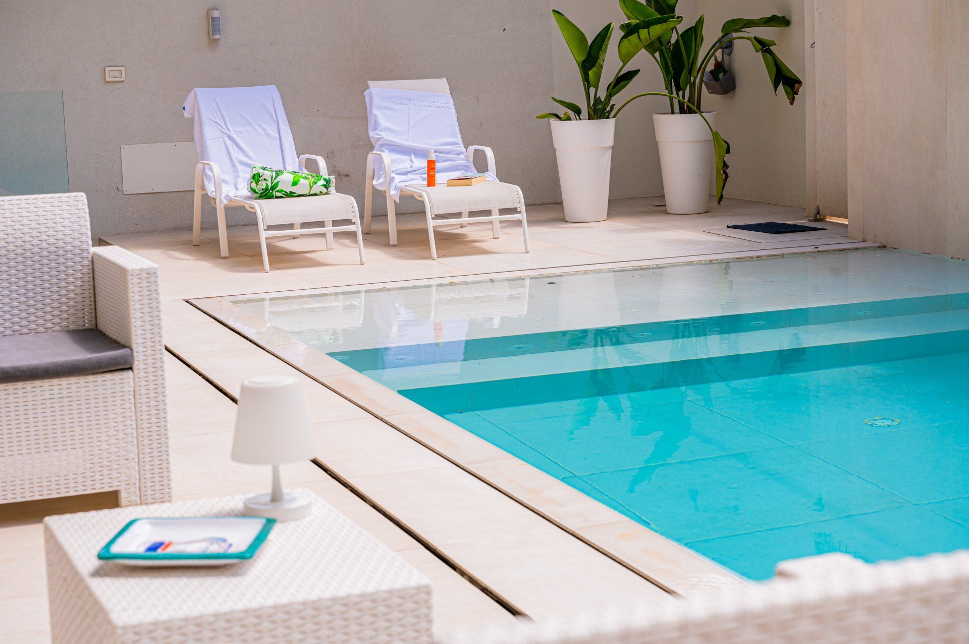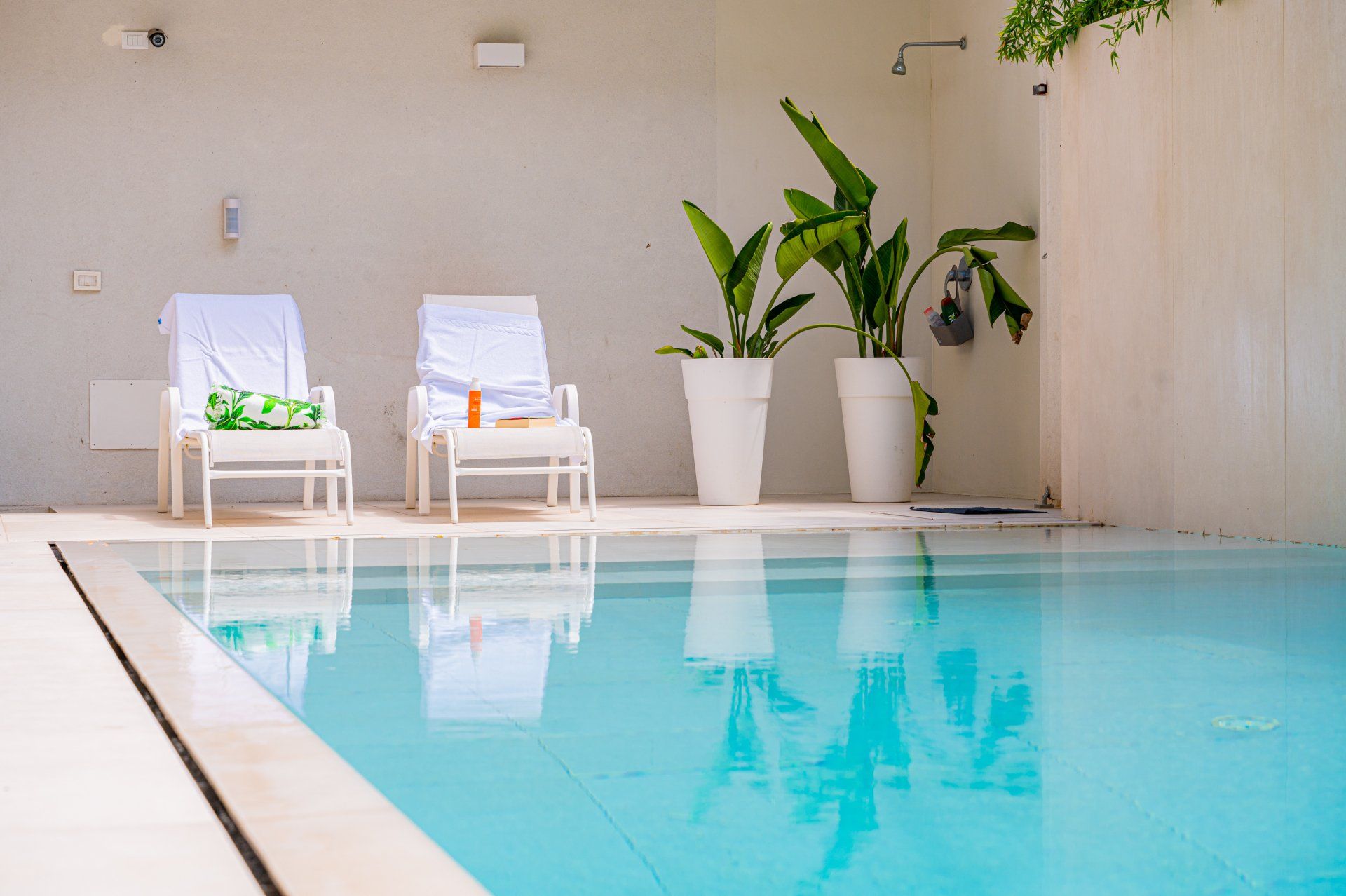Al piano terra si trova l’ingresso open space con salotto dotato di ampi divani e tv 70 pollici, cucina attrezzata con frigo congelatore, cantinetta per vini, forno da 90 cm, lavastoviglie, grande tavolo da pranzo e lavanderia, più un bagno con doccia. Lo spazio è circondato da ampie vetrate scorrevoli che danno direttamente sulla piscina solarium, salotto esterno e tavolo da pranzo all’aperto.