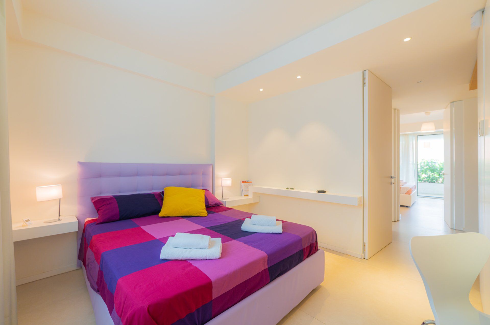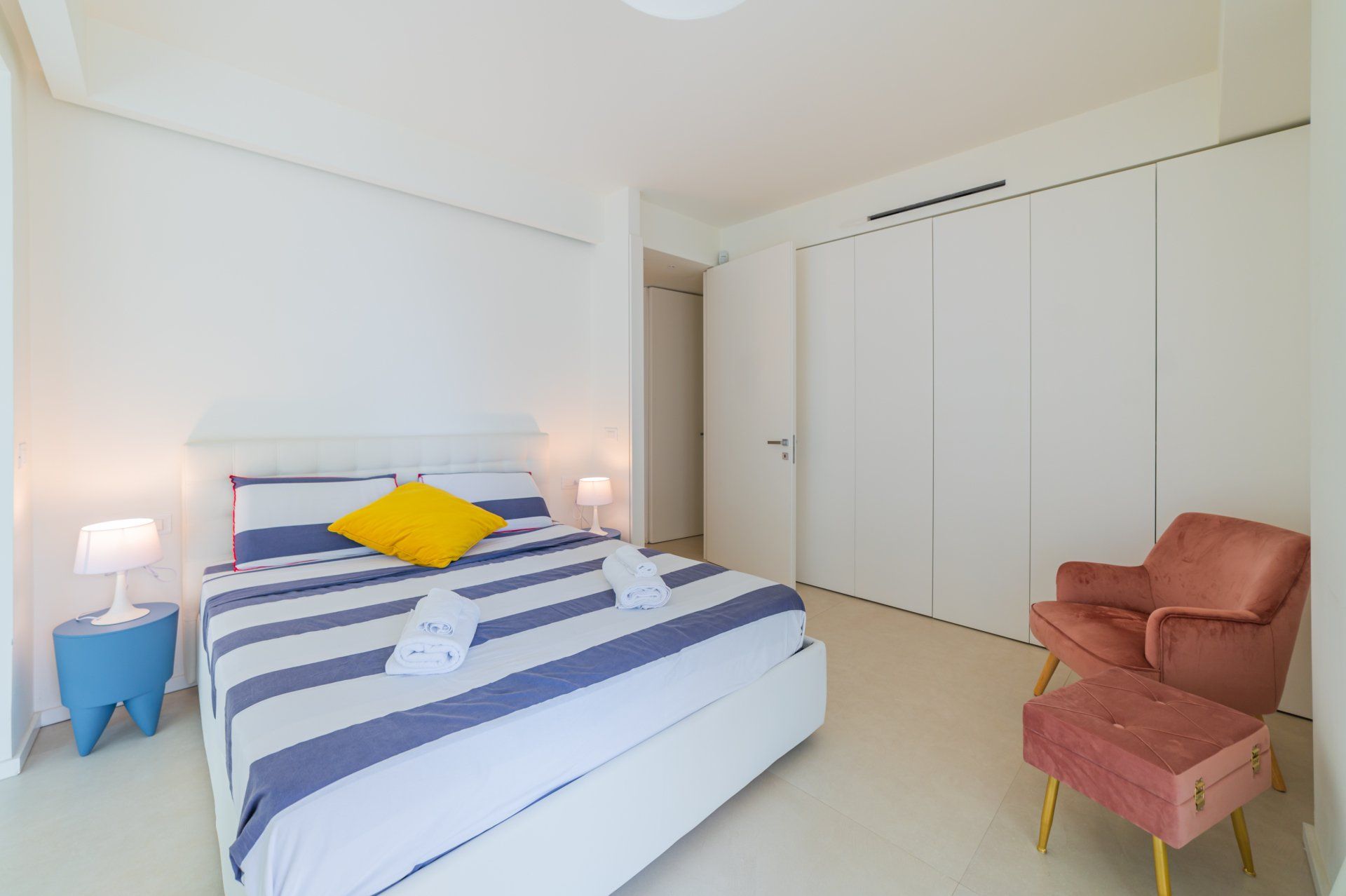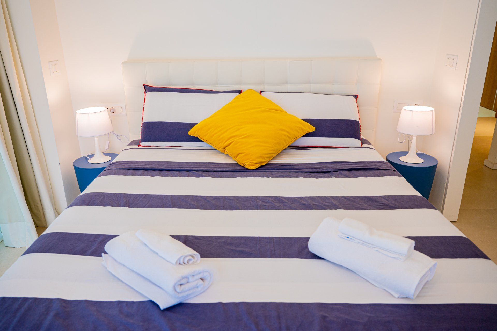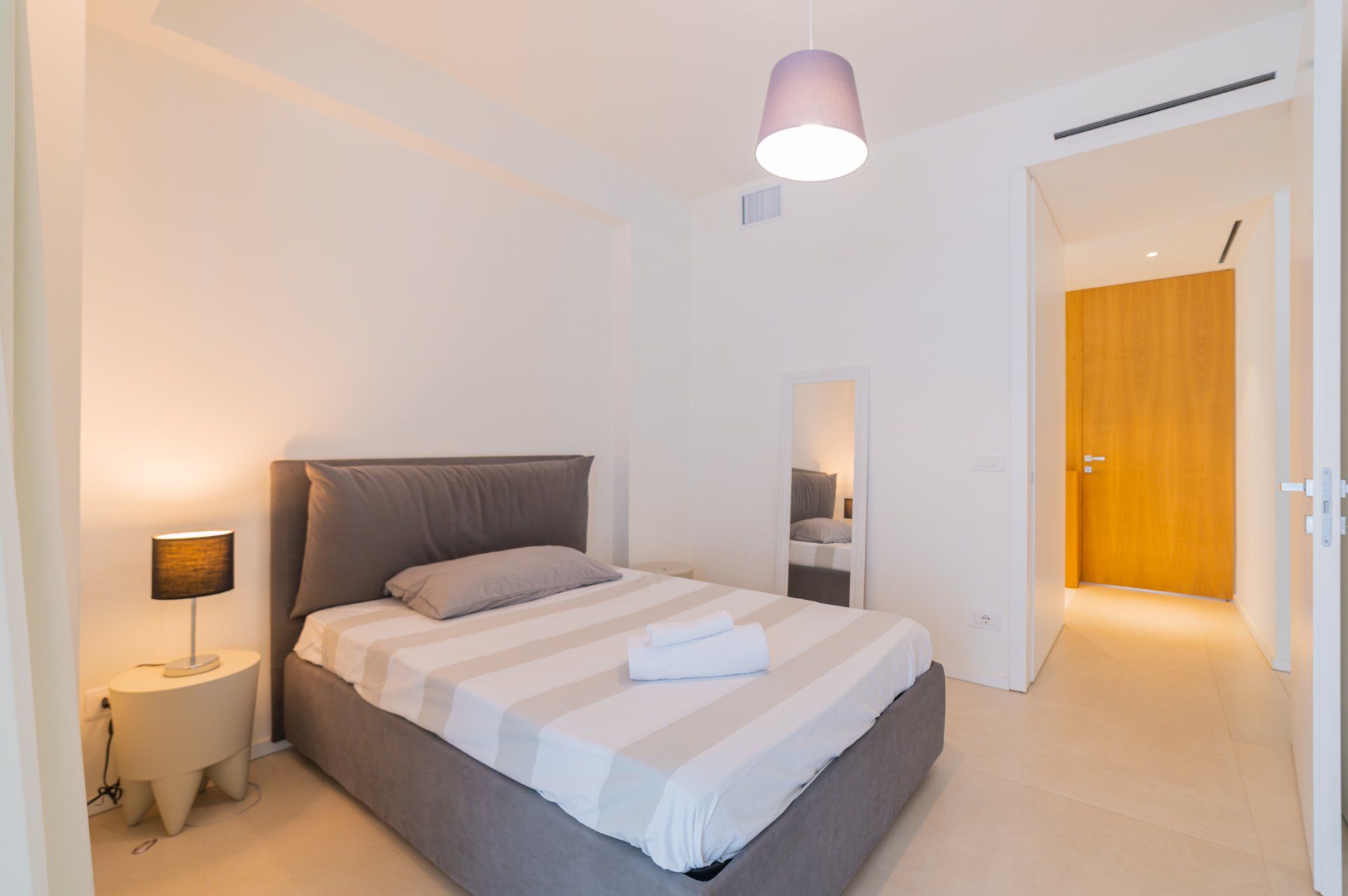 Al piano primo si trovano quattro camere da letto, tre con letto matrimoniale e una con letto da una piazza e mezzo, due bagni con grande doccia e doppi lavelli, tre camere danno su un ampio terrazzo che gira intorno all’appartamento attrezzato con divani esterni, mentre una con finestra su lato interno.