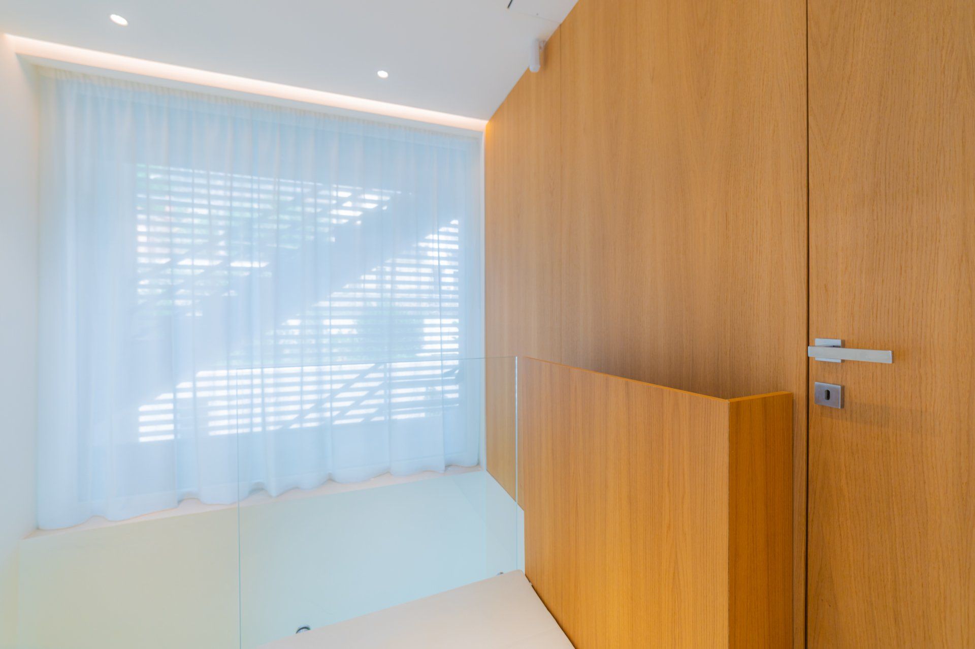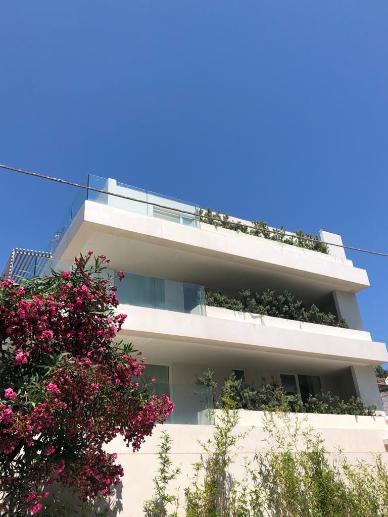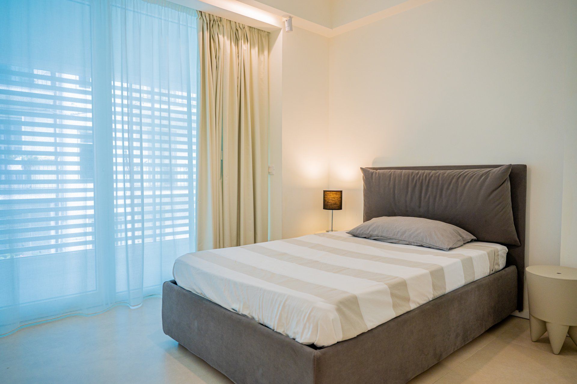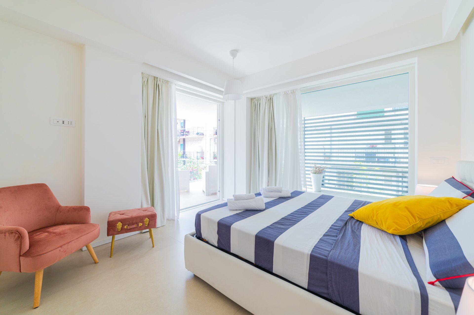 Al piano primo si trovano quattro camere da letto, tre con letto matrimoniale e una con letto da una piazza e mezzo, due bagni con grande doccia e doppi lavelli, tre camere danno su un ampio terrazzo che gira intorno all’appartamento attrezzato con divani esterni, mentre una con finestra su lato interno.